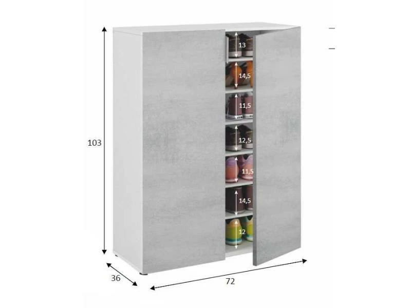 Armoire polyvalente pratique, pouvant être utilisée comme étagère à chaussures, armoire ou comme casier pour ranger tout type d’objet, idéale pour ceux qui recherchent une armoire fonctionnelle pour leur maison. Équipé de 6 étagères réglables à volonté en hauteur et éventuellement amovibles – Charnières métalliques pour les portes et pieds en ABS (thermoplastique à haute résistance au bruit) dissimulés dans la partie inférieure du meuble sont inclus. Sa polyvalence et son style simple lui permettent d’être placé dans n’importe quelle pièce, du hall à la chambre en passant par le placard. La composition blanche et béton accentue sa modernité – Livré démonté mais avec un livret d’instruction pratique et simple. Mesure 72 x 103 x 36 cm