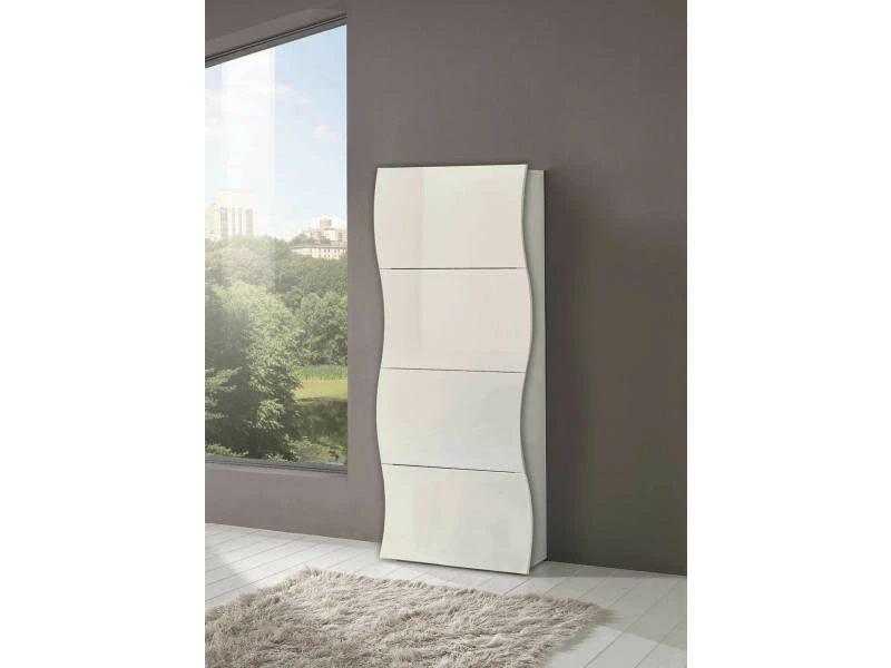 MODERN SHOE RACK: Meuble à chaussures moderne avec quatre portes à rabat, la structure est blanche brillante et a des lignes ondulées – Fonctionnel et innovant, parfait pour décorer des environnements avec des besoins d’espace avec un seul modèle élégant et fonctionnel. STRUCTURE ET UTILISATION: Pratique et élégant, c’est la solution parfaite s’il est placé dans un environnement moderne, il est très spacieux grâce à la structure à deux quatre volets – À l’intérieur, les portes à volets ont un compartiment à double capacité pour ranger les chaussures – Portes équipées de charnières métalliques solides et durables. PRATIQUE ET INNOVANT: Son design moderne et élégant rend ce meuble à chaussures avec portes parfait pour être placé dans un environnement moderne et lumineux: c’est le produit idéal pour ceux qui recherchent une armoire fonctionnelle et peu encombrante pour leur maison – La couleur blanche brillante est très moderne et en même temps s’adapte facilement à tout type d’environnement. 100% MADE IN ITALY: La production 100% italienne garantit fiabilité, résistance, confort et durabilité dans le temps l’attention portée aux processus de production, le choix des matières premières de qualité et le souci du détail font de ce produit une fabrication noble. CARACTÉRISTIQUES TECHNIQUES : Fabriqué entièrement en stratifié, il résiste aux chocs et aux rayures, et est durable dans le temps – Nettoyage rapide et facile grâce à la matière dont il est fait – Livré démonté avec kit et livret d’instructions de montage – Soin et attention particulière à l’emballage , résistant et adapté au transport – Dimensions en cm : 71x27h162