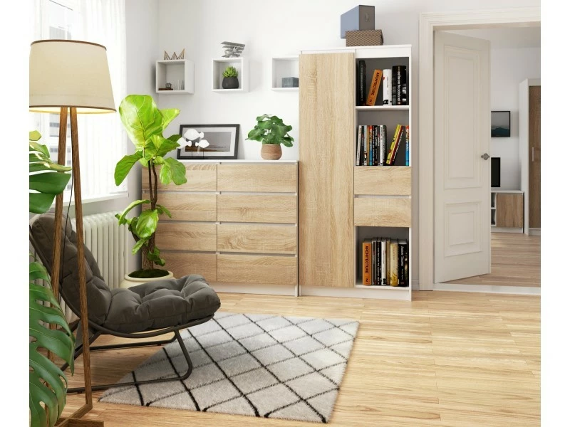 Bibliothèque de bureau, Étagère pour les livres et classeurs avec le système sans poignée (CLP). Cette bibliothèque est un meuble spacieux pour le tri des documents. De grands espaces pourront accueillir des classeurs A4, des livres et d’autres choses indispensables pour le bureau. Le design qui correspond à notre système CLP moderne suit la tendance commune de la minimisation stylistique. La conception modulaire permet d’acheter les differents modeles des biblioteques afin de completer le bureau conformement a vos attentes. Un meuble conçu pour s’accorder parfaitement avec les autres meubles de cette série. Nous vous encourageons à consulter nos autres produits. Possibilité de composer tout un ensemble de mobilier pour le séjour, la chambre, la chambre d’enfants et d’adolescent, ainsi qu’un studio et un bureau.