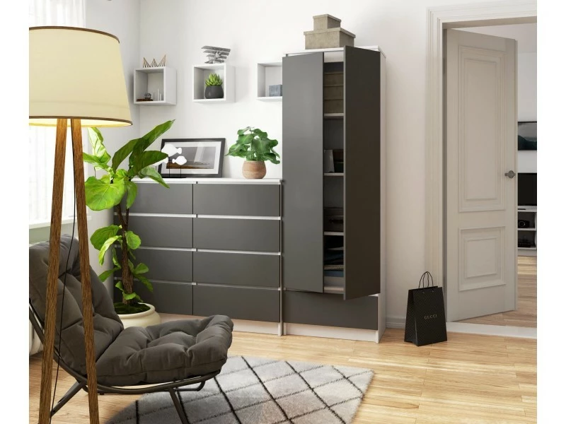 Bibliothèque de bureau, Armoire pour les livres et classeurs avec le système sans poignée (CLP). Cette bibliothèque est un meuble spacieux pour le tri des documents. De grands espaces pourront accueillir des classeurs A4, des livres et d’autres choses indispensables pour le bureau. Le design qui correspond à notre système CLP moderne suit la tendance commune de la minimisation stylistique. La conception modulaire permet d’acheter les differents modeles des biblioteques afin de completer le bureau conformement a vos attentes. Un meuble conçu pour s’accorder parfaitement avec les autres meubles de cette série. Nous vous encourageons à consulter nos autres produits. Possibilité de composer tout un ensemble de mobilier pour le séjour, la chambre, la chambre d’enfants et d’adolescent, ainsi qu’un studio et un bureau.