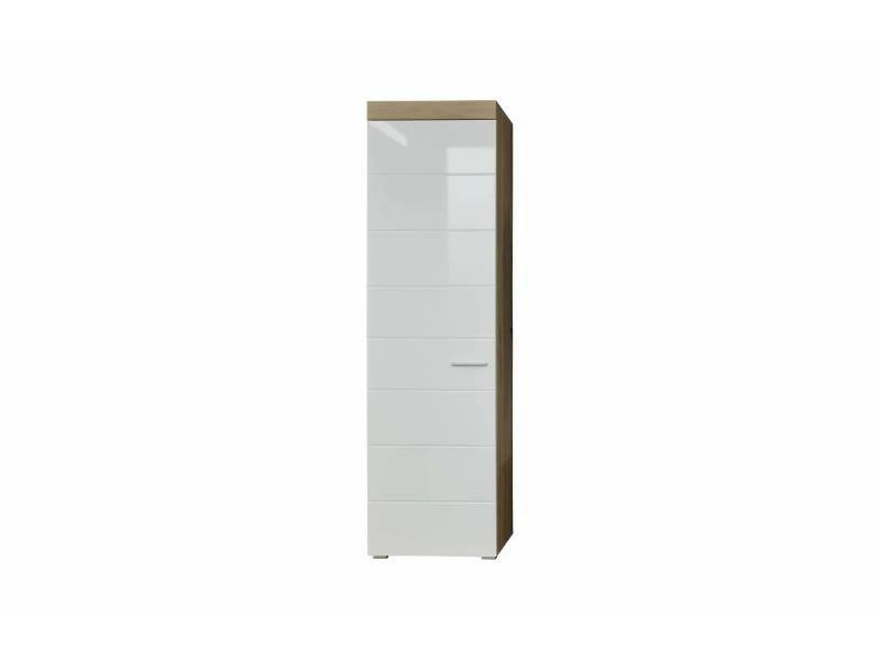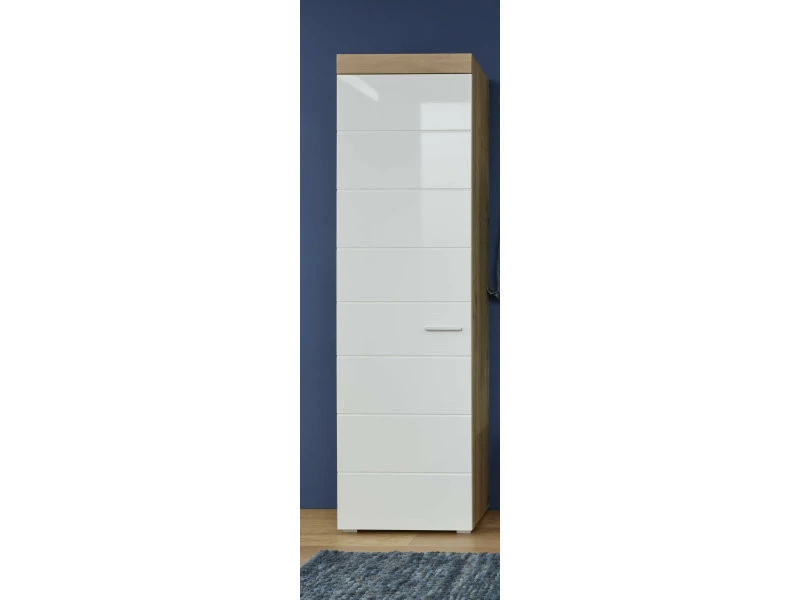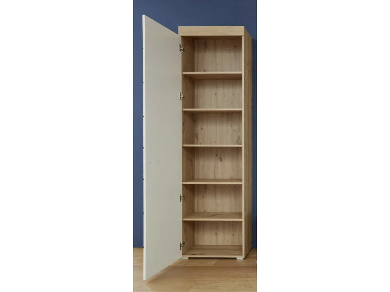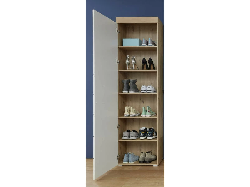 AMANDA – Meuble d’entrée – Meuble à chaussures en Mélaminé coloris chêne et blanc brillant. Largeur – Hauteur – Profondeur : 55 I 195 I 38 cm. 1 portes et 5 étagère à l’intérieur ( 4 étagères réglables et 1 fixe) . poidss maximum des étagères : 5 kg. poids maximum sur le dessus du meuble : 50kg. Conseil au montage : Les portes sont préajustées, mais il sera peut-être nécessaire de les réaligner/régler à nouveau sur place. Temps de montage estimé à 1h00. Conseil d’entretien : Utiliser un chiffon de coton humide. Ne pas utiliser de nettoyant agressif comportant des additifs. Ne pas utiliser de nettoyeur à vapeur. **A NOTER *** La livraison comprend 2 colis, pour un total de 47,2kg. Dimensions des colis (LxHxP). *1 : 216 x 41 x 7,8 cm (26,1kg). *2 : 203 x 60 x 5 (21,1kg)