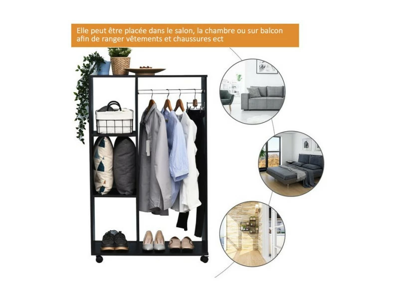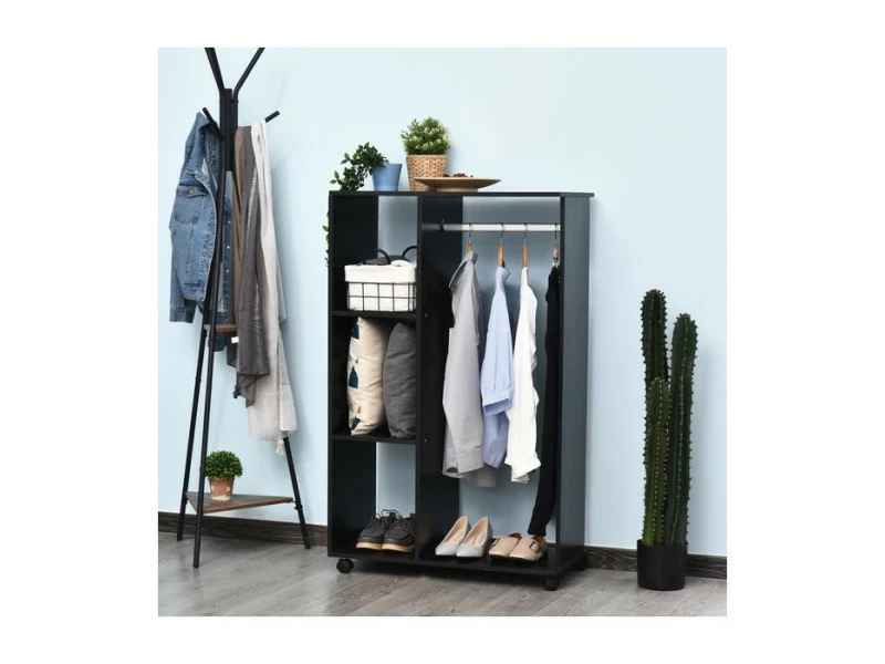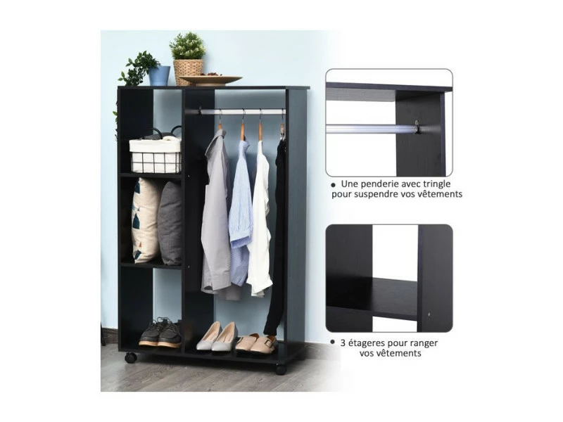 Spacieuse et amovible, l’armoire penderie JULIA de MYCOCOONING propose de beaux espaces de rangements. 3 grandes niches superposées permettent d’y entreposer des vêtements, des coussins ou du linge de toilette. Le côté penderie est suffisamment haut pour disposer des cintres pour pantalons et chemises. 4 roulettes dont 2 avec frein facilitent le déplacement de cette armoire étagère. Cela peut s’avérer très pratique pour le ménage à la maison ou pour modifier un espace de vente à l’intérieur d’un magasin. Les matériaux robustes lui assurent de durer dans le temps.