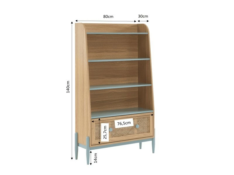 Cette dernière est dotée de 3 étagères bleues, ainsi que d’1 tiroir avec habillage en cannagevéritable. Ses pieds, en bois massif coloris bleu, lui confère solidité et stabilité.