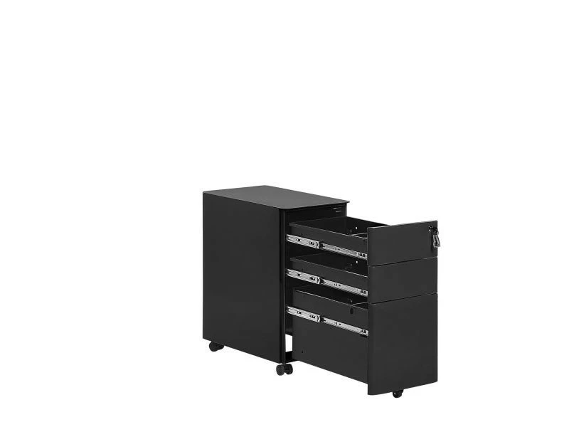 Caisson de bureau noir avec 3 tiroirs spacieux et roulettes pratiques. Ce caisson en métal noir est une solution parfaite pour organiser vos documents et fournitures de bureau. Ses 3 tiroirs offrent beaucoup d’espace de rangement, qui plus est l’un d’eux dispose d’une fermeture à clé pour vous permettre de garder vos objets de valeur en toute sécurité. Fabriquée à partir de métal robuste et durable, ce bloc tiroir est stable et nécessite qu’un entretien minimal pour vous servir pendant de nombreuses années. Ce caisson pratique comporte aussi des roulettes intégrées, qui le rendent facilement déplaçable d’un endroit à un autre. Grâce au design minimaliste, ce caisson de bureau se marie bien avec n’importe quel style d’intérieur.