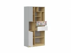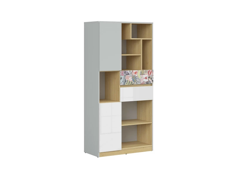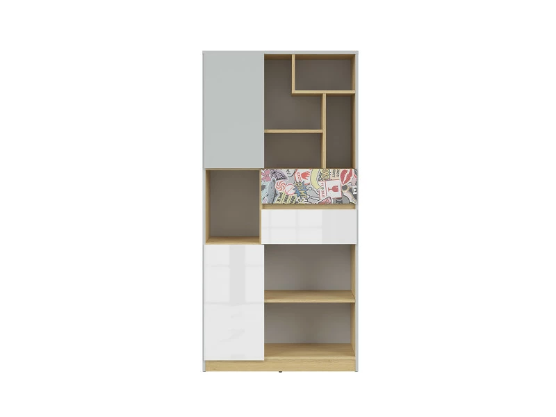 Bibliothèque 2 portes 2 tiroirs Pop Gris, Blanc et Sticker