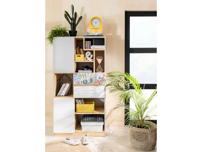 CaractĂ©ristiques : 11 niches de rangement – 2 portes – 2 tiroirs – Portes et tiroirs Ă©quipĂ©s du système de fermeture silencieuse
