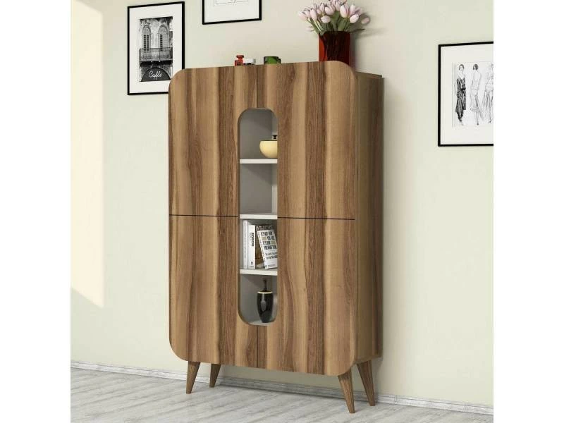 Sublimez votre bureau ainsi que l intérieur de votre maison avec cette magnifique bibliothèque TURINGO. Cette bibliothèque ne vous laissera pas indifférent grâce à son beau design scandinave. Les 2 portes composées de 6 niches offrent suffisamment de place pour les livres, les CD, les accessoires de bureau, etc. Ce meuble de rangement donnera une touche moderne à votre salon, bureau, chambre, couloir, etc. Matériau : Bois Couleur : Bois et Blanc crème Dimension : 93 x 31,8 x 144 cm (L x P x H)