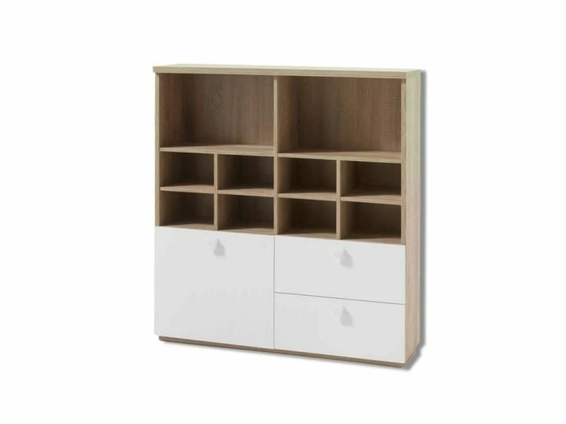 Bibliothèque comprenant 1 porte, 2 tiroirs et 10 niches, bicolore et bi-matière, pour une ambiance moderne et nature.