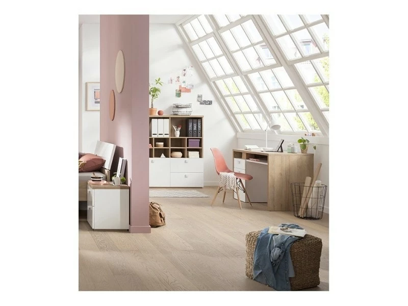 Découvrez la collection de mobilier GABRIEL, un mélange bicolore et bi-matière qui combine un décor chêne clair et un blanc laqué ultra brillant. D’élégantes poignées dans un style moderne viennent rehausser le blanc laqué. Un mobilier de qualité fabriqué en Italie.