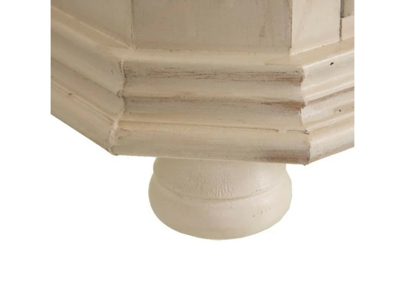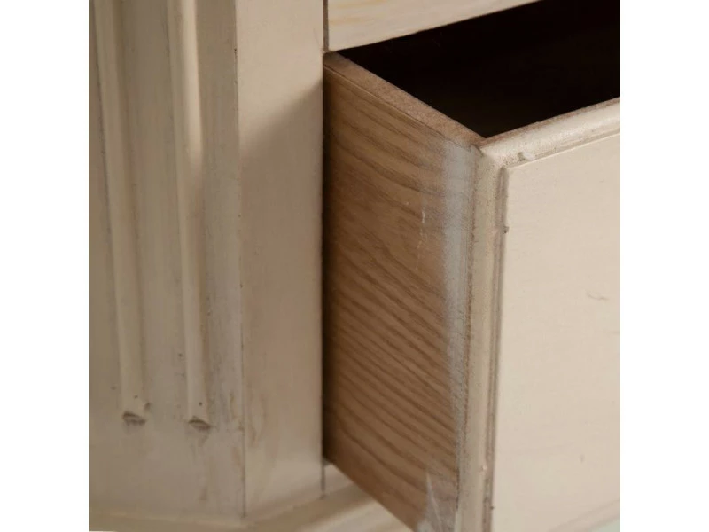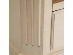 Pour moderniser sagement ce meuble de rangement, une mise en teinte crème est mariée à fonds aspect lambris mettant en oeuvre du bois de Paulownia à la teinte chaude, la belle qualité preçue est assurée par une très légère patine dans les moulures.