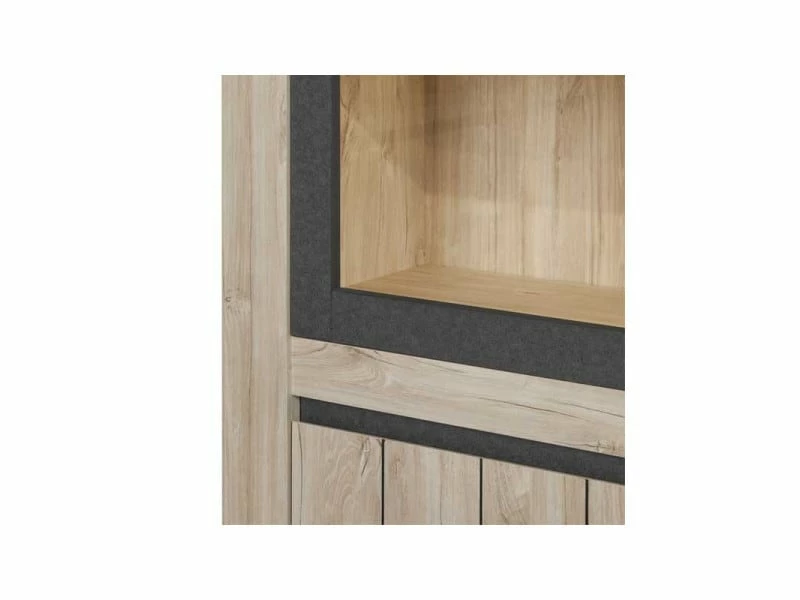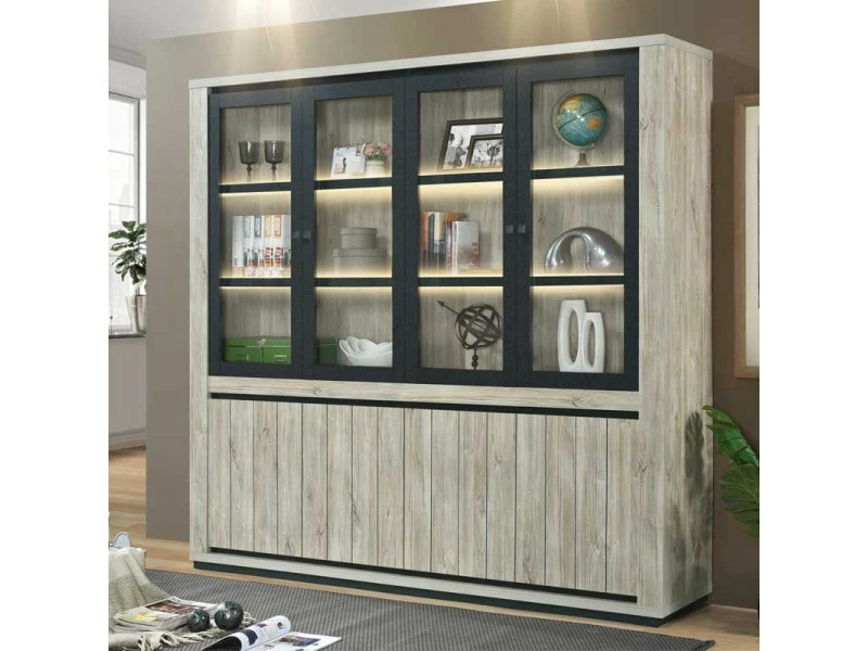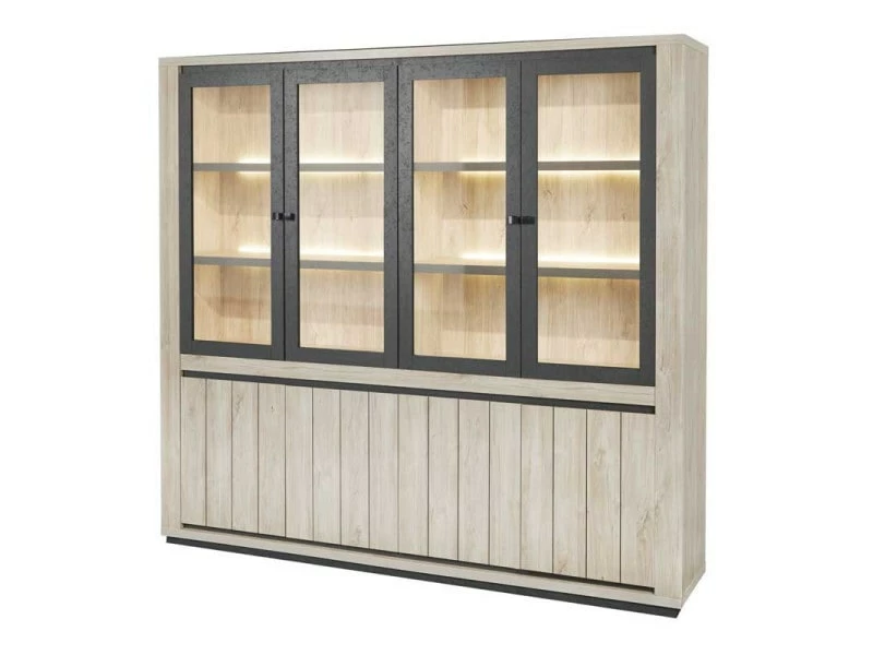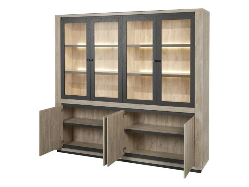 Les 4 portes vitrĂ©es de la partie haute libèrent l’accès de robustes Ă©tagères en bois, vous y mettrez alors en valeur quelques beaux objets de dĂ©co grâce au rĂ©troĂ©clairage LED’s.