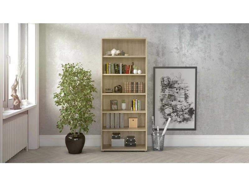 Bibliothèque avec cinq Ă©tagères, couleur chĂŞne, 89,2 x 221,7 x 40,1 cm. Bibliothèque essentielle Ă cinq Ă©tagères aux lignes très simples qui rappellent un style moderne. Solution idĂ©ale pour le salon et la chambre, il est parfait s’il est placĂ© dans des environnements modernes et lumineux. Entièrement rĂ©alisĂ© en stratifiĂ©, il est durable dans le temps, rĂ©sistant aux chocs et aux rayures et est facile Ă nettoyer.