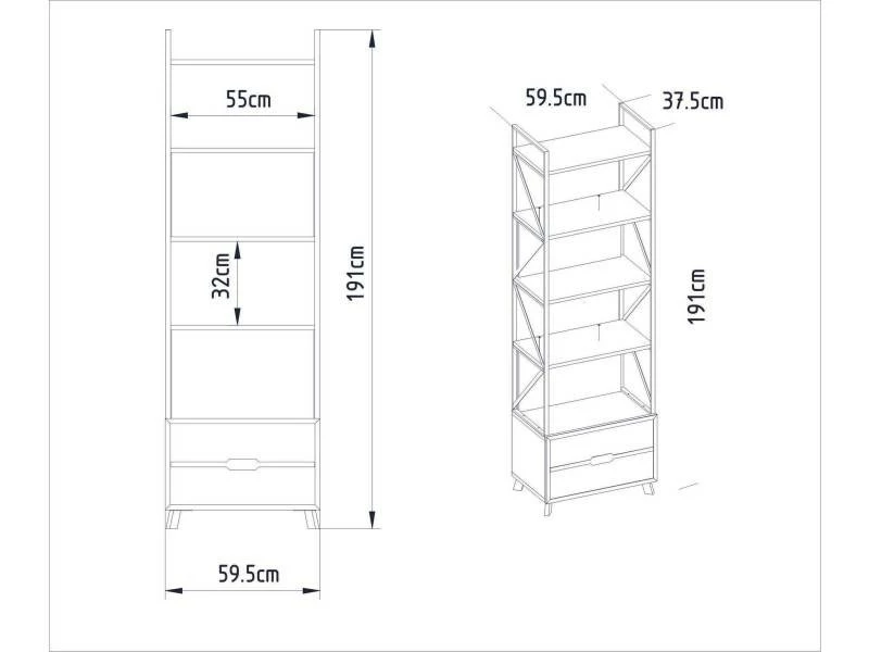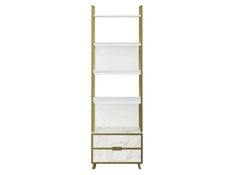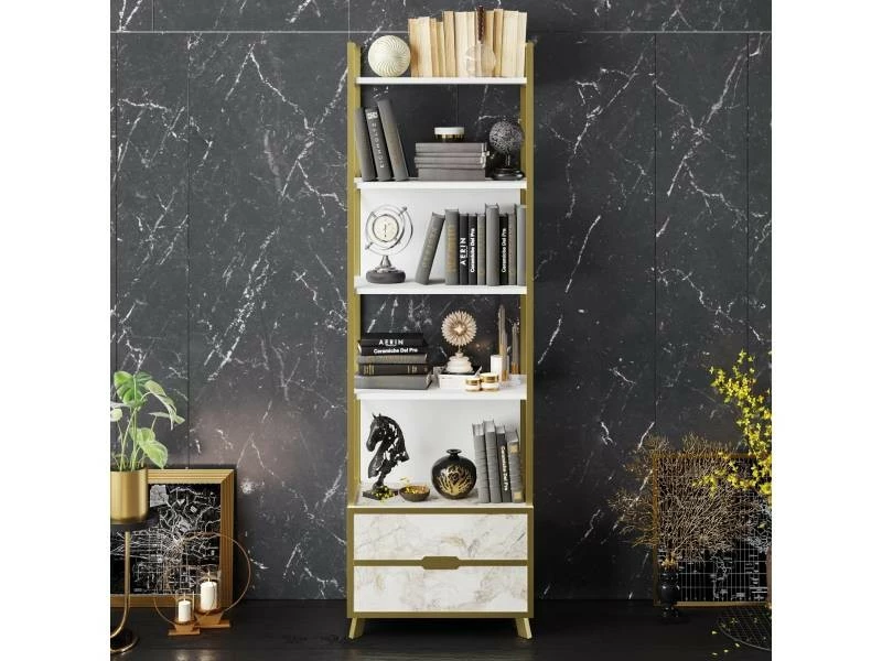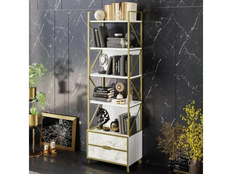 Jetez un coup d œil à la bibliothèque Barbara, à 6 niveaux ; avec 5 étagères et un compartiment inférieur, elle amènera à votre maison l atmosphère rustique et industrielle que vous désiriez. Le cadre est en métal doré, et le bois est un panneau de particules épais, ce qui en fait une pièce durable et abordable. Dans son compartiment spacieux, avec une finition effet marbre blanc, vous pouvez cacher tout ce qui doit être rangé à l abri des regards. Les photos et les autres objets décoratifs seront joliment mis en valeur sur les étagères.