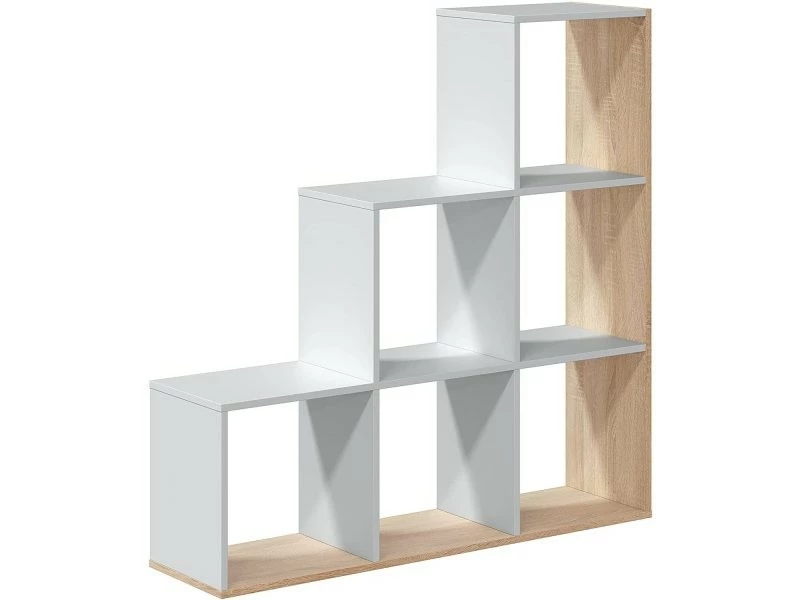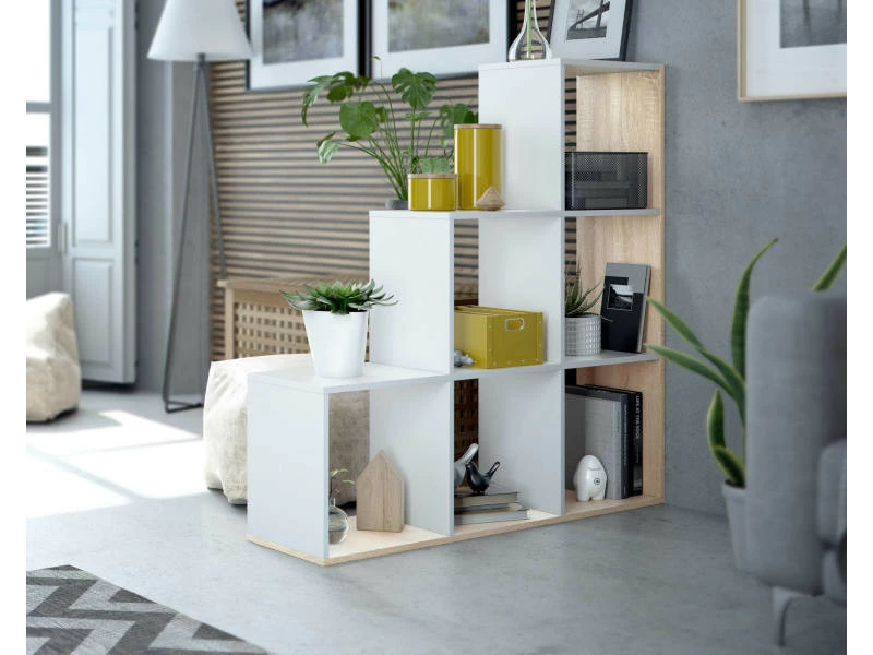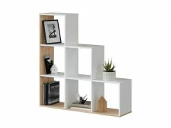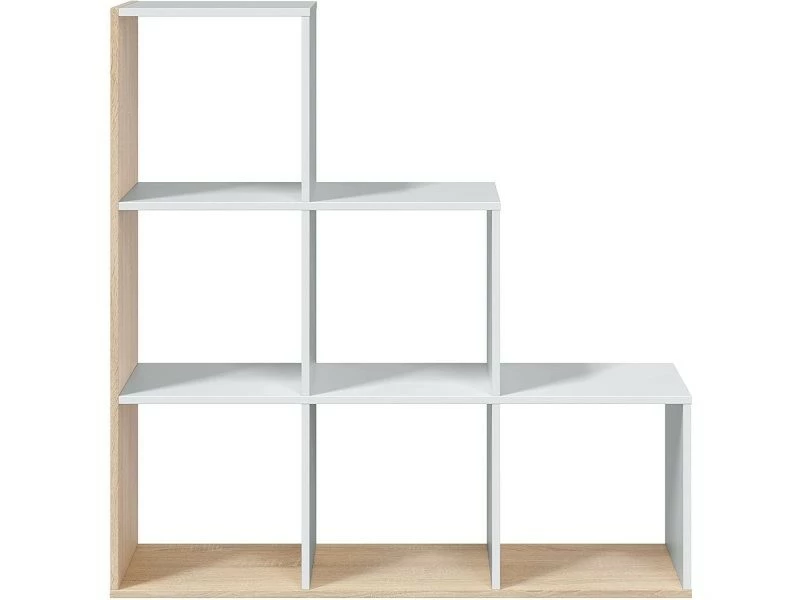 Bibliothèque décorative à six compartiments, couleur blanc et chêne. Structuré pour meubler au mieux votre salon, c’est aussi la solution idéale pour séparer deux pièces ou la chambre des enfants. Sa composition crée un effet de marche qui peut également servir d’étagère. Cette bibliothèque est parfaite pour être placée dans un environnement moderne et lumineux. Fabriqué entièrement en stratifié, il résiste aux chocs et aux rayures et est durable dans le temps, dimensions en cm : 108 x 110 x 28