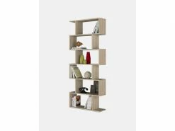 Bibliothèque double face en stratifié couleur chêne. Cette bibliothèque est la solution idéale pour ceux qui recherchent un élément innovant et moderne à ajouter à leur chambre ou leur salon. Formé de six compartiments asymétriques placés les uns au-dessus des autres, il crée un effet ondulé, décoratif et en même temps fonctionnel avec des plots en ABS anti-bruit et anti-rayures et équipé de quincaillerie pour la fixation au mur. Excellente solution pour un salon moderne et lumineux. Mesure 80 x 192 x 25 cm