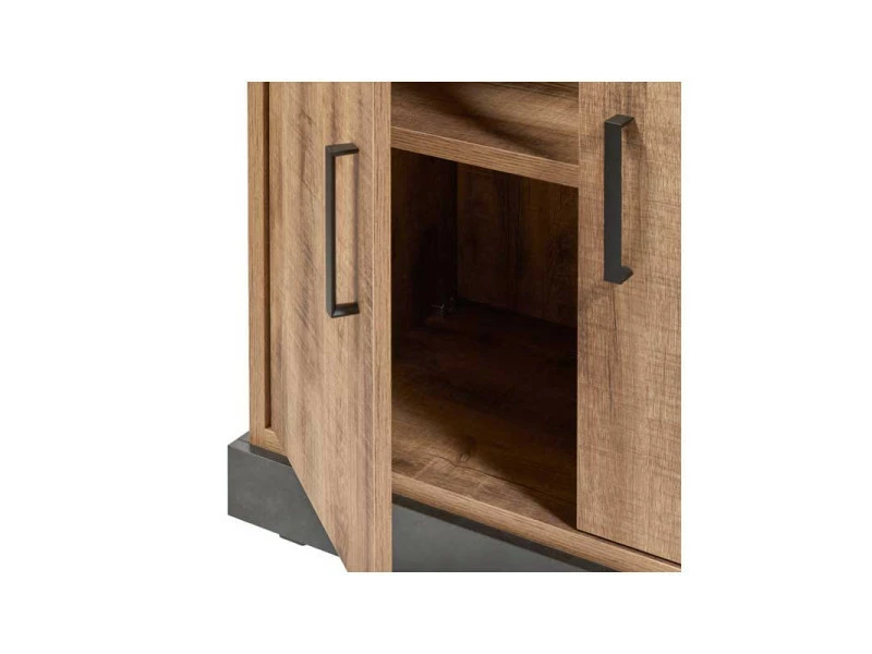 Mettant en avant une finition bois tropical au rendu plus vrai que nature, ce très grand meuble de rangement ne manquera pas d’apporter de la chaleur dans votre coin détente ou dans votre coin repas. Le mariage avec une finition façon métal (portes du haut, socle et champ du plateau) offre à ce mobilier une signature visuelle exclusive et une qualité perçue réellement haut de gamme.