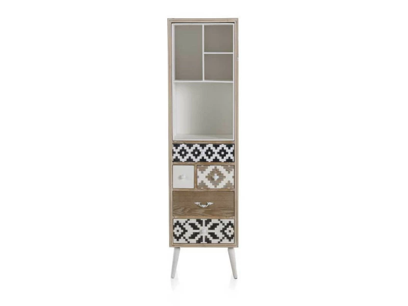 L’association d’un bois teinte naturelle, d’Ă©lĂ©ments peints en blanc et de motifs gĂ©omĂ©triques agrĂ©mentant les tiroirs apporteront de l’originalitĂ©.