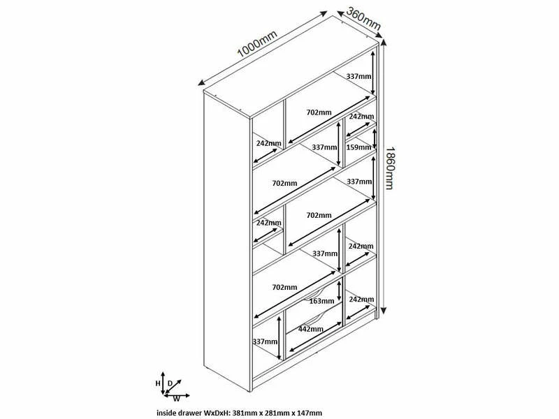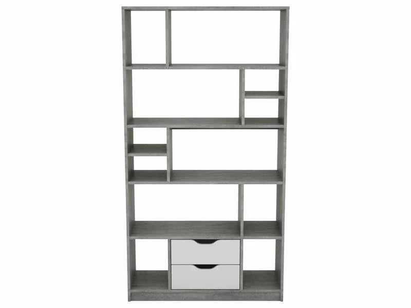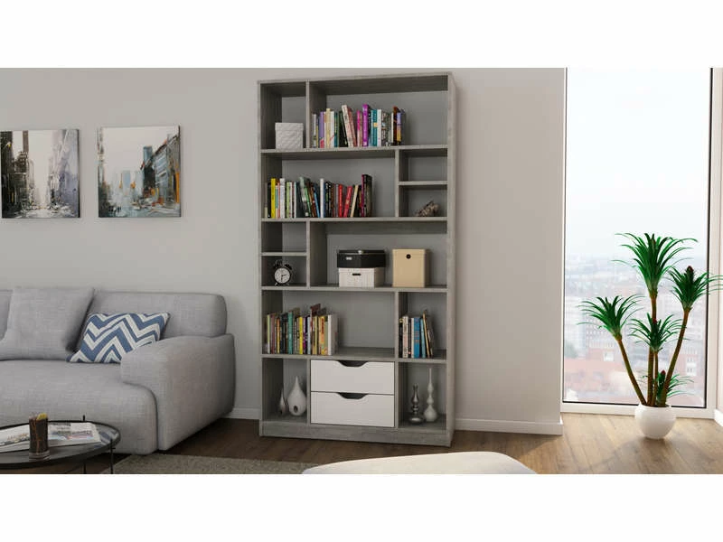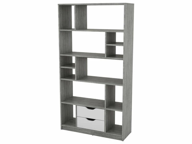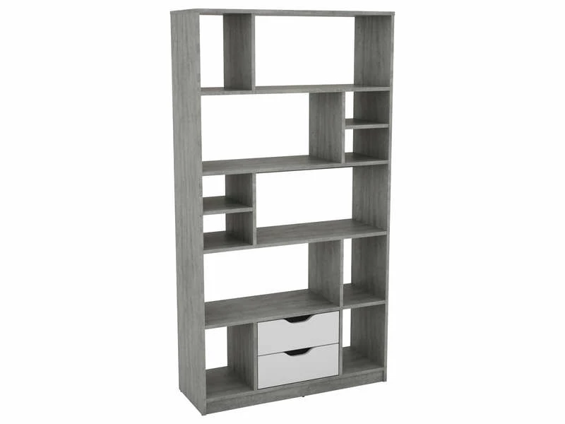 Avec son design moderne et aérien, cette bibliothèque bois gris et blanche va apporter du style à votre intérieur. Dotée de treize niches séparées et ouvertes ainsi que de deux tiroirs, elle vous permettra d’y classer vos livres et d’y déposer vos luminaires. Pratique, elle s’installe également en cloison pour agencer votre espace.