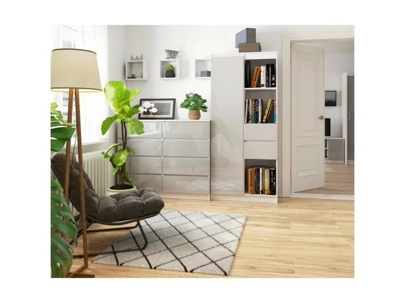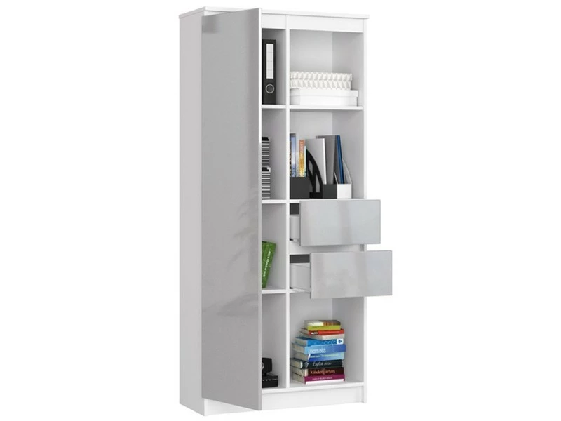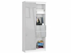 La bibliothèque de bureau est faite en panneau stratifié solide de 16 mm d’épaisseur qui résiste à l’abrasion. Grâce à son aspect universel, ce meuble s’intègre parfaitement à tous les intérieurs. Il conviendra parfaitement à un bureau élégant, à un salon minimaliste ou même à une chambre d’enfant. La bibliothèque est équipée d’espaces ouverts et d’étagères qui sont l’endroit idéal pour y mettre des souvenirs et des bibelots. Deux tiroirs spacieux seront l’endroit idéal pour ranger des documents ainsi que des objets pratiques, POINTS FORTS: Style moderne, 1 portes, 2 tiroirs, Design élégant et pratique, Faces sans poignée, Finition des façades : brillant, CARACTÉRISTIQUES TECHNIQUES: Hauteur : 180 cm, Largeur : 80 cm, Profondeur : 35cm, Matériau : panneau laminé, À monter soi-même, Photos des articles le plus fidèle possible, mais restant non contractuelles, les nuances de couleur et le rendu des matières présentés à l’écran pouvant être différents de la réalité