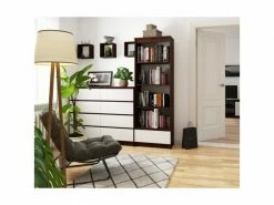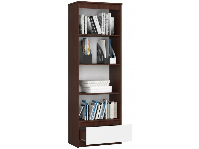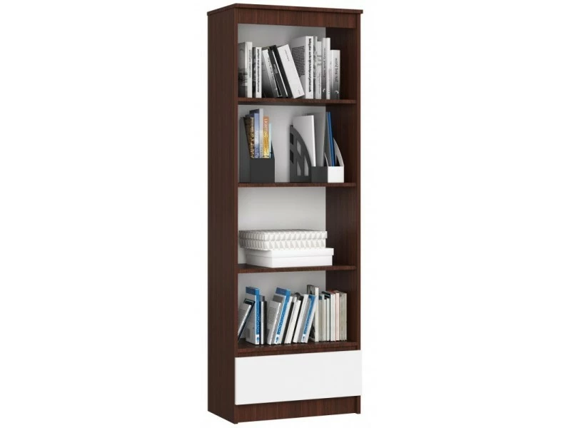 Cette bibliothèque élégante renouvellera l’intérieur de n’importe quel bureau ou pièce. Le design est minimaliste mais robuste et durable. Elle convient pour le rangement de livres, de classeurs ou d’accessoires de bureau et de cadres photo. Les dimensions ergonomiques et le design moderne permettent de meubler librement la pièce. Le corps du meuble est de couleur wengé, tandis que la façade des tiroirs sont de couleur blanche, POINTS FORTS: Style moderne, 4 tablettes, 1 tiroir, Construction pratique et élégante, Face sans poignée, Finition de la façade : mat, CARACTÉRISTIQUES TECHNIQUES: Hauteur : 180cm, Largeur : 60cm, Profondeur : 35cm, Matériau : panneau laminé, À monter soi-même, Photos des articles le plus fidèle possible, mais restant non contractuelles, les nuances de couleur et le rendu des matières présentés à l’écran pouvant être différents de la réalité