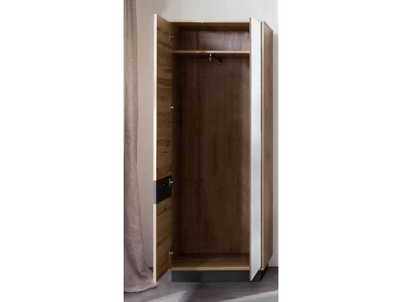 COAST – Meuble chambre. Armoire en mélaminé coloris chêne avec finition gris ciment avec 1 porte miroir + LED. Largeur – Hauteur – Profondeur : 69 – 191 – 35 cm. 2 portes dont 1 porte miroir avec à l’intérieur soit 1 penderie avec 1 étagère et 1 barre de cintre / soit 12 étagères amovibles + LED intégrée. poidss maximum par étagère : 5 kg (voir notice). Temps de montage estimé à 1h00. Conseil au montage : Les portes sont préajustées, mais il sera peut-être nécessaire de les réaligner/régler à nouveau sur place. Conseil d’entretien : Utiliser un chiffon de coton humide. Ne pas utiliser de nettoyant agressif comportant des additifs. Ne pas utiliser de nettoyeur à vapeur. ***A NOTER *** La livraison comprend 2 colis, pour un total de 45,8kg. Dimensions des 2 colis (LxHxP). *1 : 125 x 46 x 9,2 cm (19,3kg). *2 : 192,5 x 41,5 x 7 cm (26,5kg).