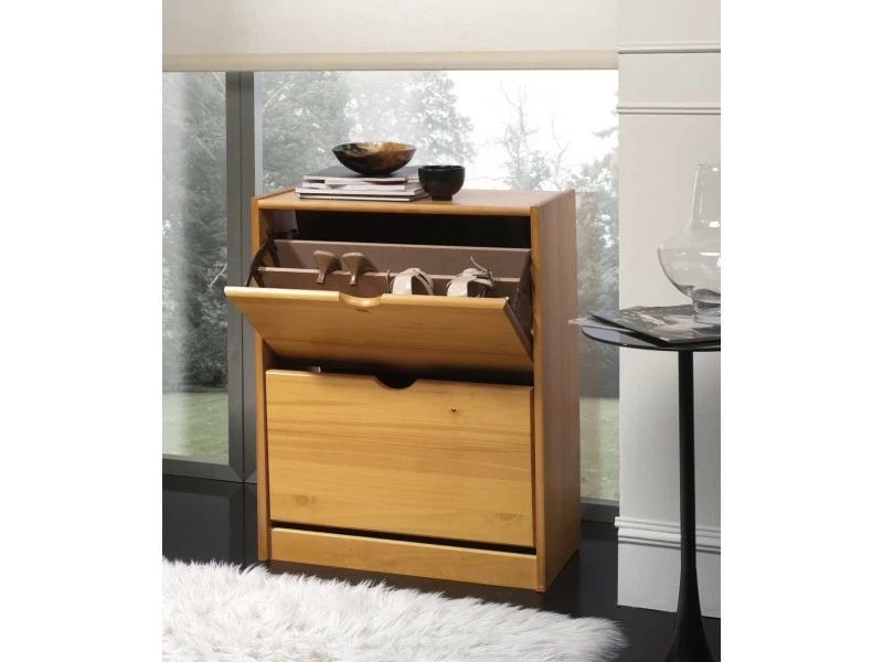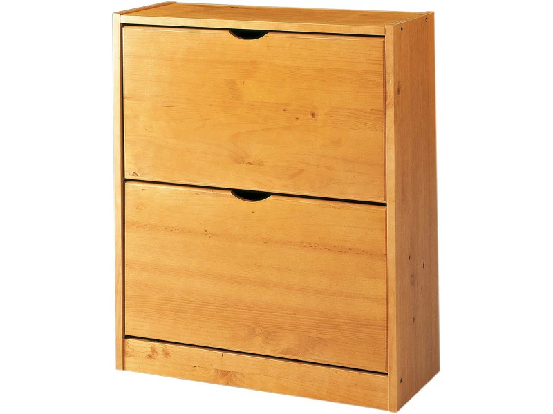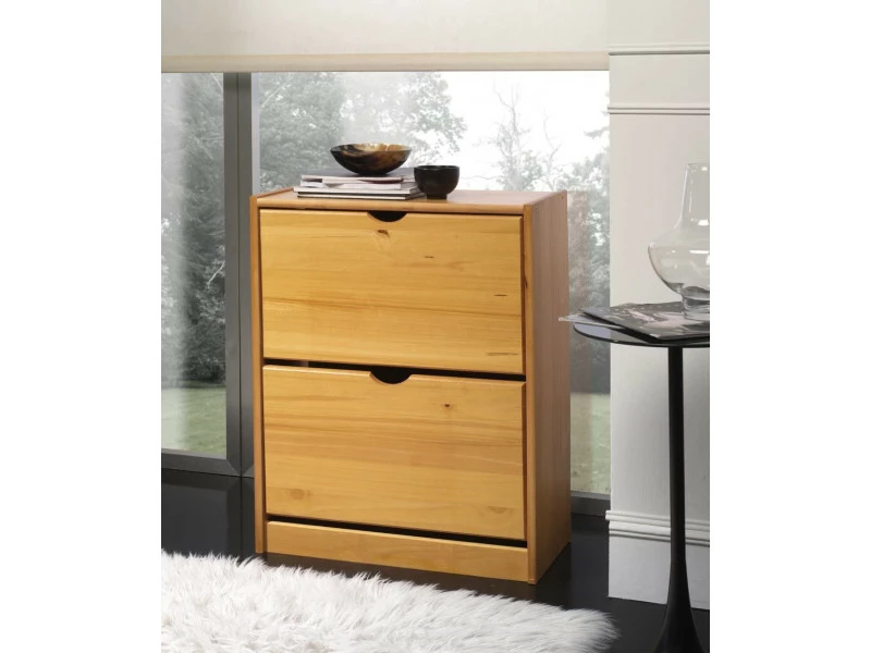 Commode Meuble à chaussures avec 2 portes rabattables en pin massif coloris Miel Dimensions : Longueur 63 x Profondeur 27 x Hauteur 77 cm Matière : pin massif Couleur : Miel Poids : 10 kg