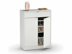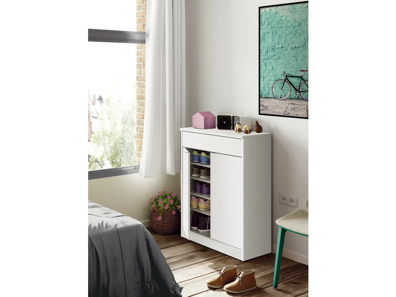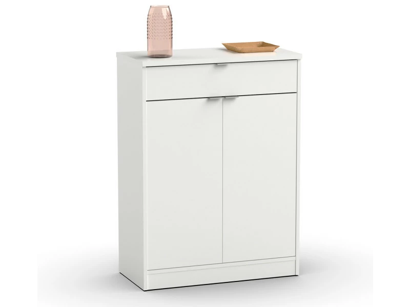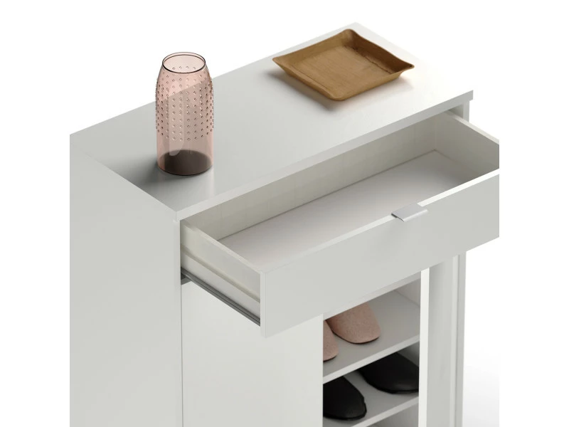 Meuble de rangement pour 20 paires de chaussures coloris blanc brillant fabriqué en panneaux de particules haute densité, de 2 portes avec étagères réglables, poignées en plastique avec finition en aluminium et 1 tiroir avec guides métalliques. Produit de fabrication Espagnol certifié PEFC. Livré en kit. Dimensions : Hauteur 101 x Longueur 75 x Profondeur 36 cm Dimensions étagères : hauteur environ 14 x Longueur 70 cm x profondeur 31 cm Matière : panneaux de particules et mélamine haute densité Coloris : blanc brillant Poids : 34 kg