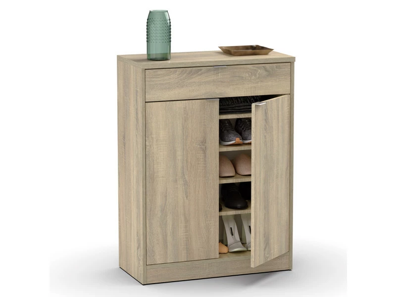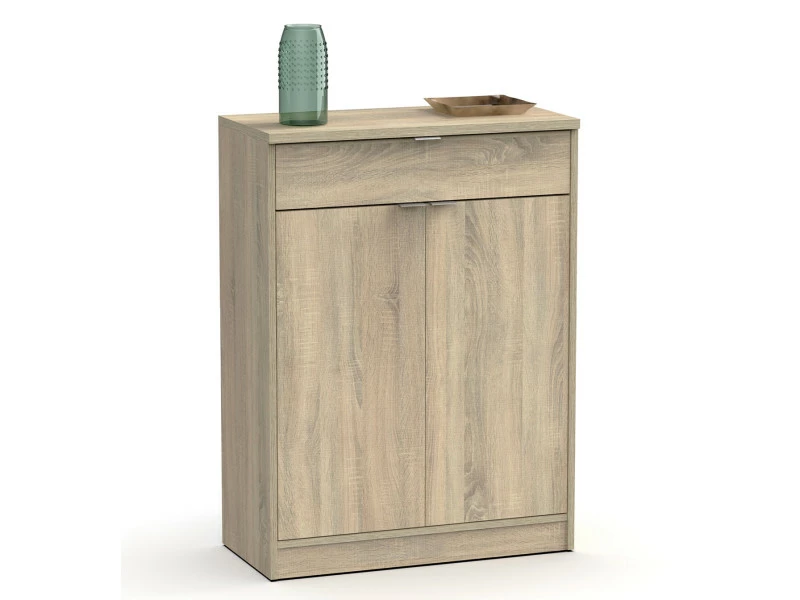 Commode meuble à chaussures pour 20 paires de chaussures coloris cambrian. Fabriqué en panneaux de particules haute densité, avec 2 portes (4 étagères réglables en hauteur), poignées en plastique avec finition aluminium et 1 tiroir avec guides métalliques. Produit de fabrication Espagnol certifié PEFC. Livré en kit. Dimensions : Hauteur 101 x Longueur 75 x Profondeur 36 cm Dimensions étagères : hauteur environ 14 x Longueur 70 cm x profondeur 31 cm Matière : panneaux de particules et mélamine haute densité Coloris : cambrian Poids : 35 kg