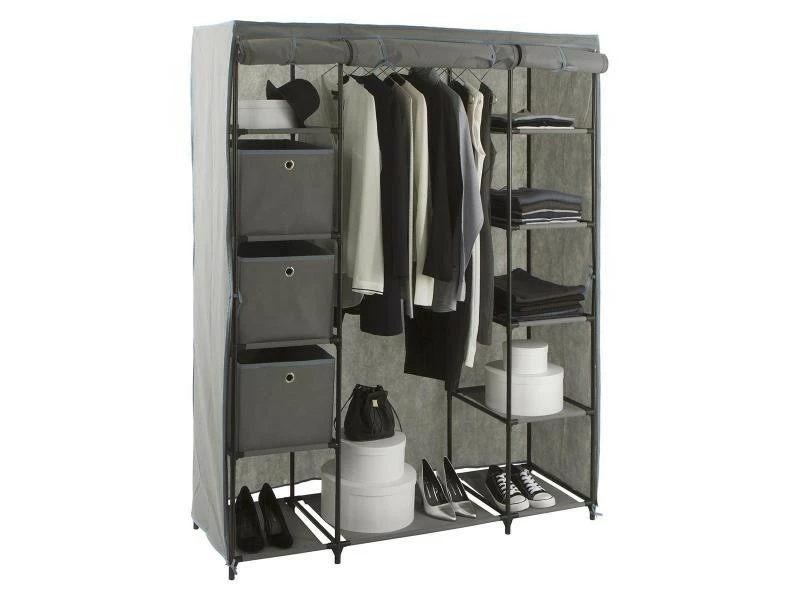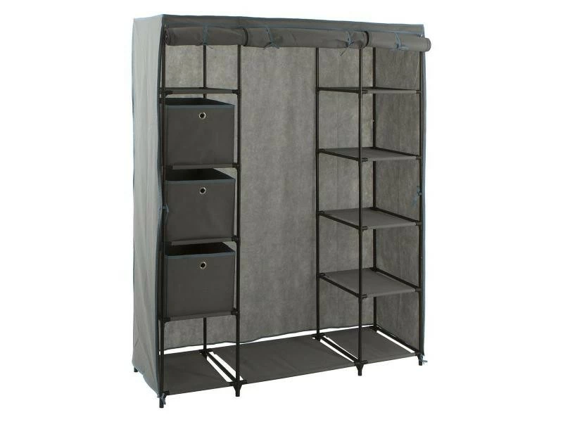 Capable d’accueillir un grand nombre de vêtements à suspendre ou à ranger sur ses étagères et ses boites de rangement, cette armoire souple de couleur grise est le mobilier d’appoint grandement pratique indispensable.