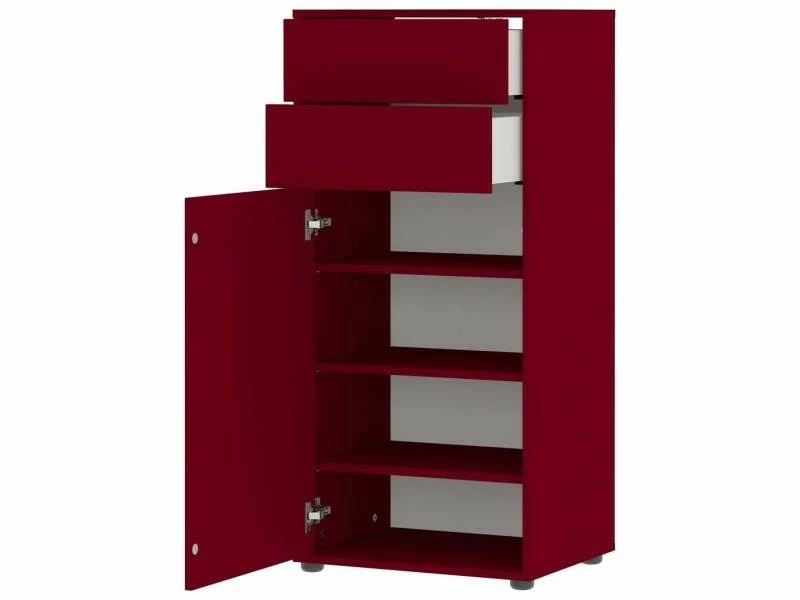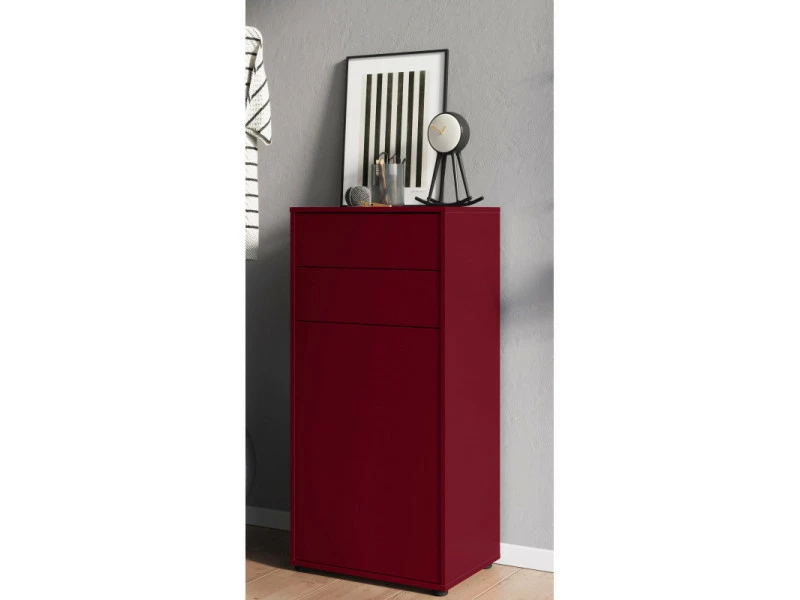 Cette armoire à chaussures GW-Madeo de la marque Germania est une armoire à chaussures parfaite pour couloir avec beaucoup d’espace pour les chaussures. Elle est faite d’aggloméré stratifié dans une belle couleur rouge rubis. L’armoire à chaussures se compose de deux tiroirs et de trois étagères réglables (chacune avec une capacité de charge allant jusqu’à 10 kg) qui offrent un espace de rangement pour divers articles essentiels du quotidien et jusqu’à 8 paires de chaussures. Cet étagère à chaussures facile à assembler est visuellement attrayante et offre également une excellente expérience utilisateur avec des raccords à ouverture par pression et des fonctions d’amortissement de la porte.