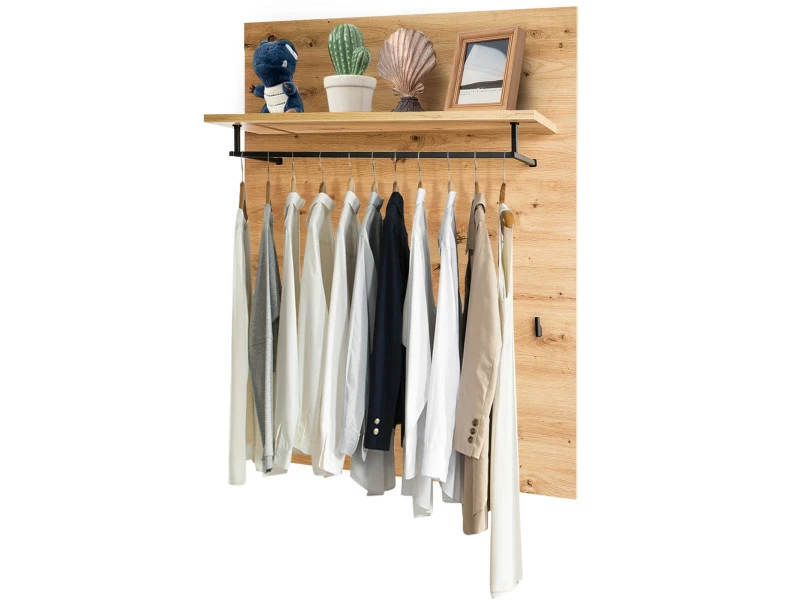 Vous en avez assez de chercher des vĂȘtements de tous les jours en dĂ©sorganisant votre armoire ? Cette Ă©tagĂšre murale Ă fixer vous permettra d’organiser vos vĂȘtements et vos petits objets. L’Ă©tagĂšre comprend une tablette, une barre portante et 5 crochets afin de garder les vĂȘtements en ordre. Vous n’avez pas Ă vous soucier de la fiabilitĂ© Ă l’utilisation. FabriquĂ©e en bois composite de premiĂšre qualitĂ©, l’Ă©tagĂšre est durable et suffisamment rĂ©sistante pour un usage quotidien.