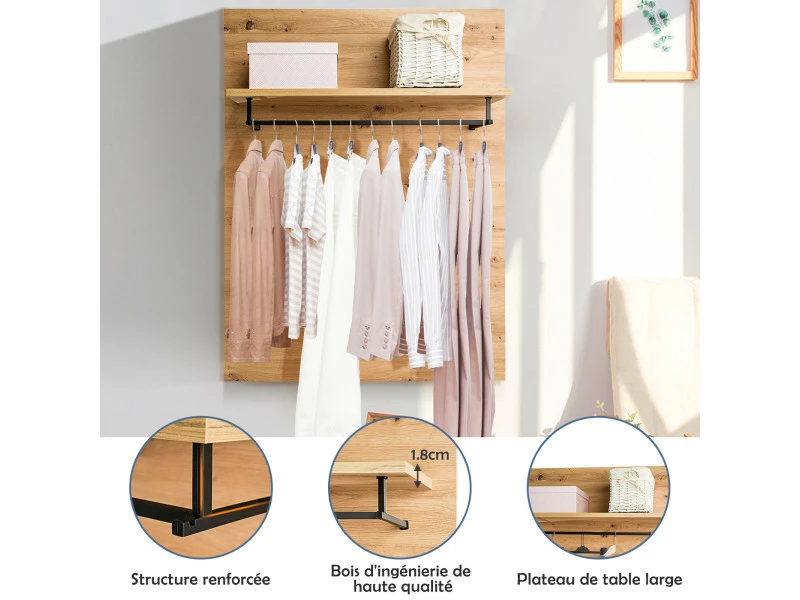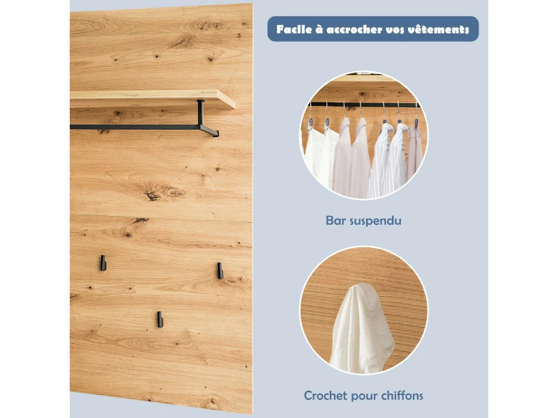 - ăGain de place et conception pratique :ăAfin d’offrir une utilisation optimisĂ©e de l’espace, la penderie est conçue pour ĂȘtre fixĂ©e au mur. Elle est ainsi parfaite pour les espaces limitĂ©s. Vous pourrez poser ou accrocher vos vĂȘtements, sacs et autres articles sur lâĂ©tagĂšre ou sa barre de suspension.
