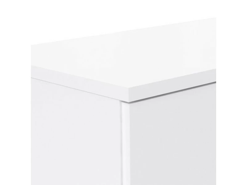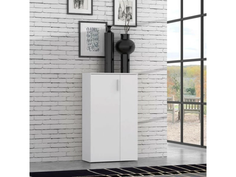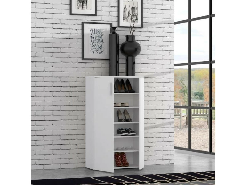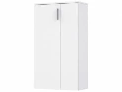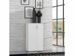 BOOTS Meuble a chaussures – Panneaux de particules blanc mat- Style et design contemporain – 2 portes aménagée avec 5 tablettes – Environ 18 paires de chaussure – Fabrication européenne – Dimensions totales L 89,9 x P 36,3 x H 120,4 cm.