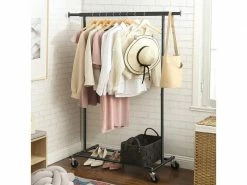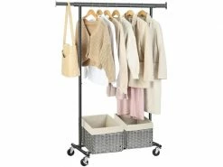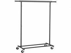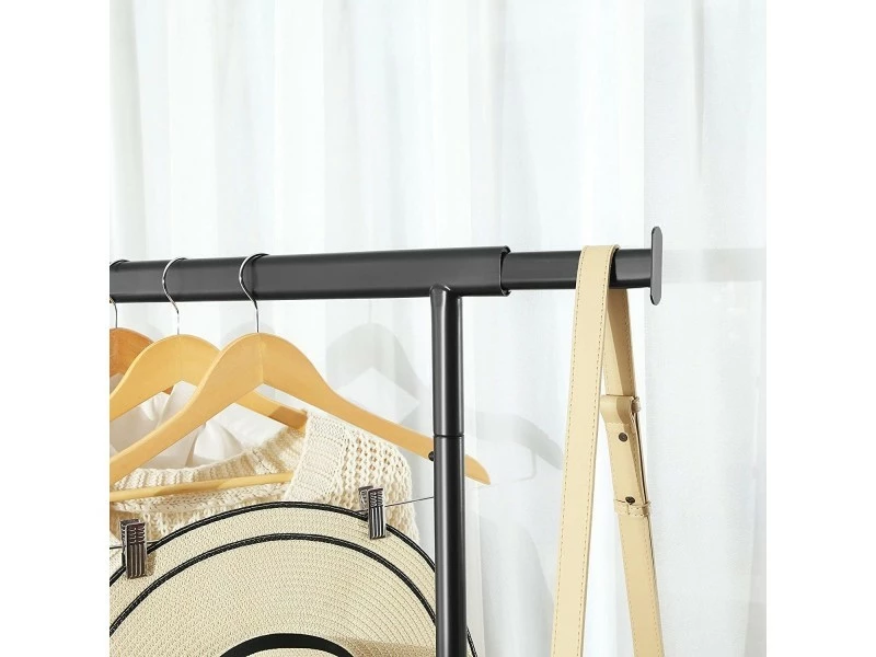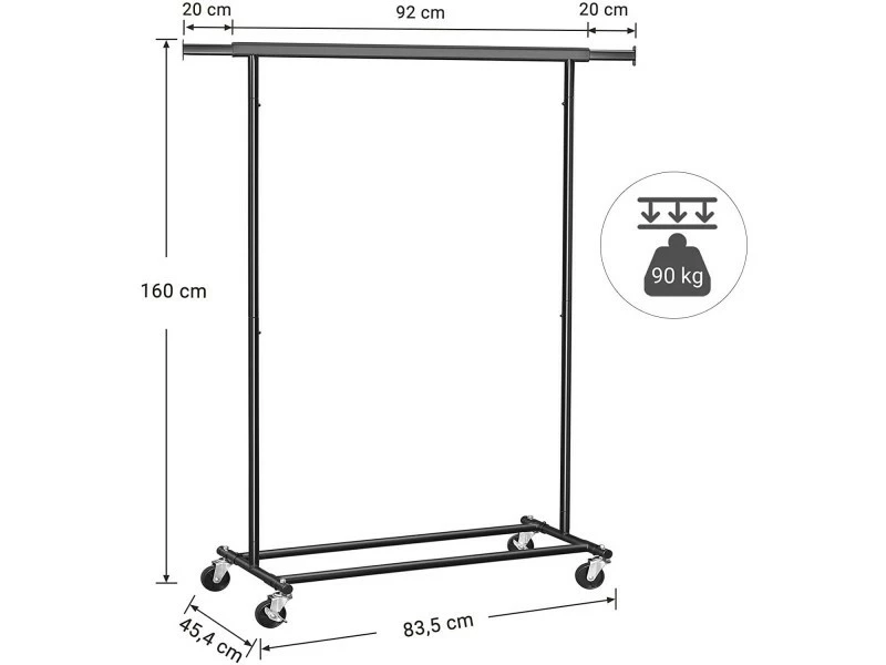 Le portant est dotĂ© d’une tringle très stable et solide et d’une tablette spacieuse. La structure en acier de la base garantit la stabilitĂ© du meuble. Le portant est Ă©quipĂ© de larges roulettes pivotantes qui permettent de le dĂ©placer facilement dans la pièce. Deux des roulettes sont Ă©quipĂ©es de verrous, ce qui permet d’immobiliser le meuble. La tringle peut ĂŞtre prolongĂ©e de 20 cm de chaque cĂ´tĂ© pour offrir un espace de suspension supplĂ©mentaire. La charge maximale du portant est de 90 kg., POINTS FORTS: Style moderne, 1x tablette, 1x tringle Ă vĂŞtements, Finition : le tout en coloris noir, La structure en acier de la base garantit la stabilitĂ© du meuble., Facile de maintenir en bon Ă©tat de propretĂ©., CARACTÉRISTIQUES TECHNIQUES: Largeur 92 cm, Profondeur 45.4 cm, Hauteur 160 cm, MatĂ©riau : acier, Ă€ monter soi-mĂŞme, Photos des articles les plus fidèles possible, mais restant non contractuelles, les nuances de couleur et le rendu des matières prĂ©sentĂ©s Ă l’Ă©cran pouvant ĂŞtre diffĂ©rents de la rĂ©alitĂ©