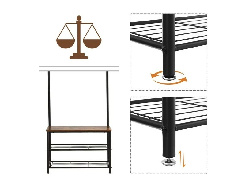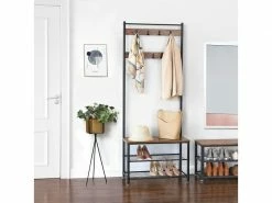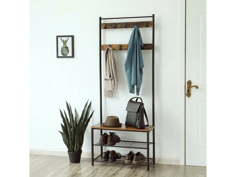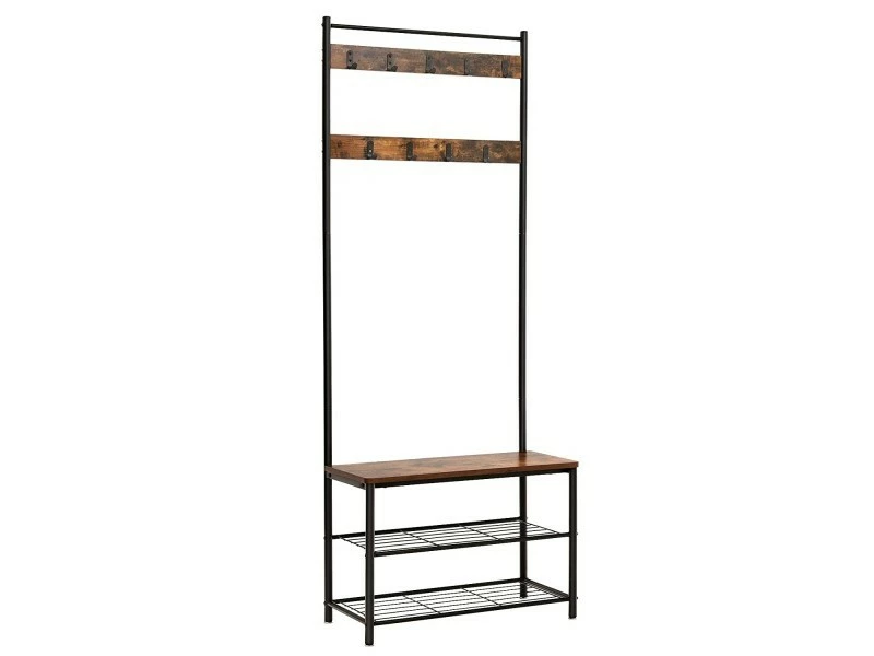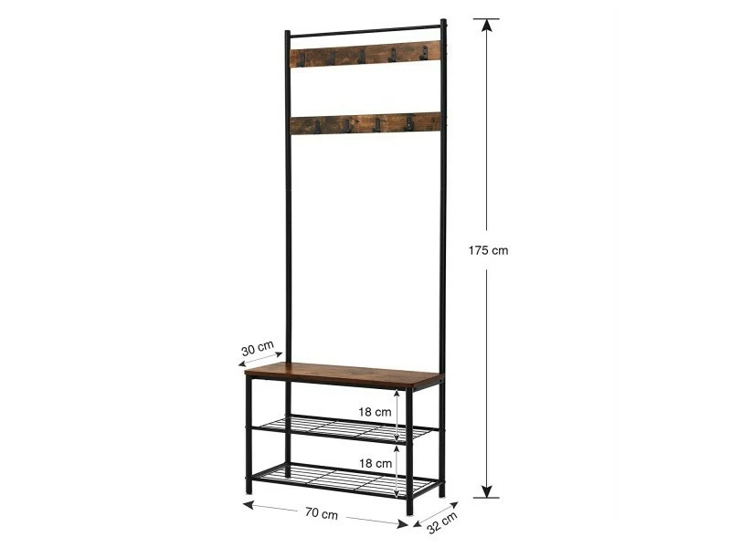 Le porte-manteaux comporte un total de 9 crochets disposĂ©s en 2 rangĂ©es : la première rangĂ©e comporte 5 crochets, tandis que la deuxième rangĂ©e en comporte 4. Il dispose Ă©galement d’une assise et d’une tringle. En bas, vous disposez de 2 Ă©tagères Ă chaussures robustes et spacieuses. La structure mĂ©tallique garantit la stabilitĂ© du meuble. La charge maximale par crochet est de 3 kg et pour l’assise 80 kg. Les pieds rĂ©glables permettent de mettre le meuble Ă niveau., POINTS FORTS: Style industriel, 2x tablette, 9x crochet, 1x tringle, Finition : cadre et tablettes en coloris noir, assise en coloris marron rustique, Construction stable, Fait en matĂ©riaux de haute qualitĂ©, CARACTÉRISTIQUES TECHNIQUES: Profondeur 32 cm, Largeur 70 cm, Hauteur 175 cm, MatĂ©riau : panneau de particules, mĂ©tal, Ă€ monter soi-mĂŞme, Photos des articles les plus fidèles possible, mais restant non contractuelles, les nuances de couleur et le rendu des matières prĂ©sentĂ©s Ă l’Ă©cran pouvant ĂŞtre diffĂ©rents de la rĂ©alitĂ©