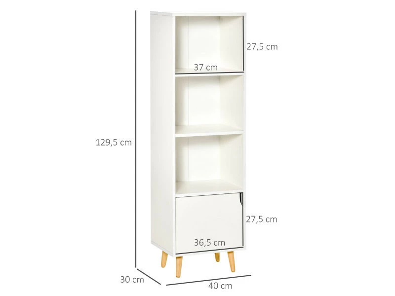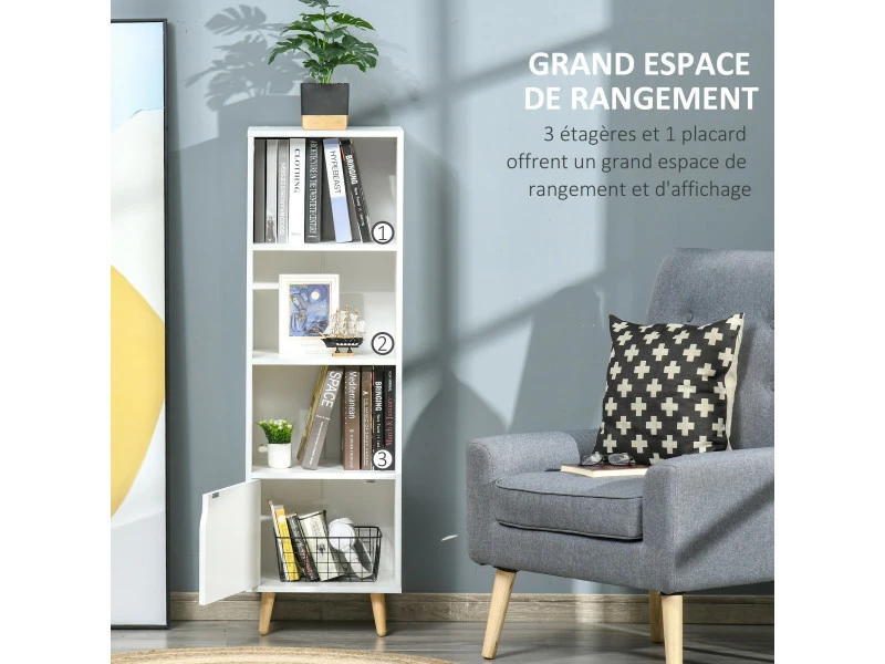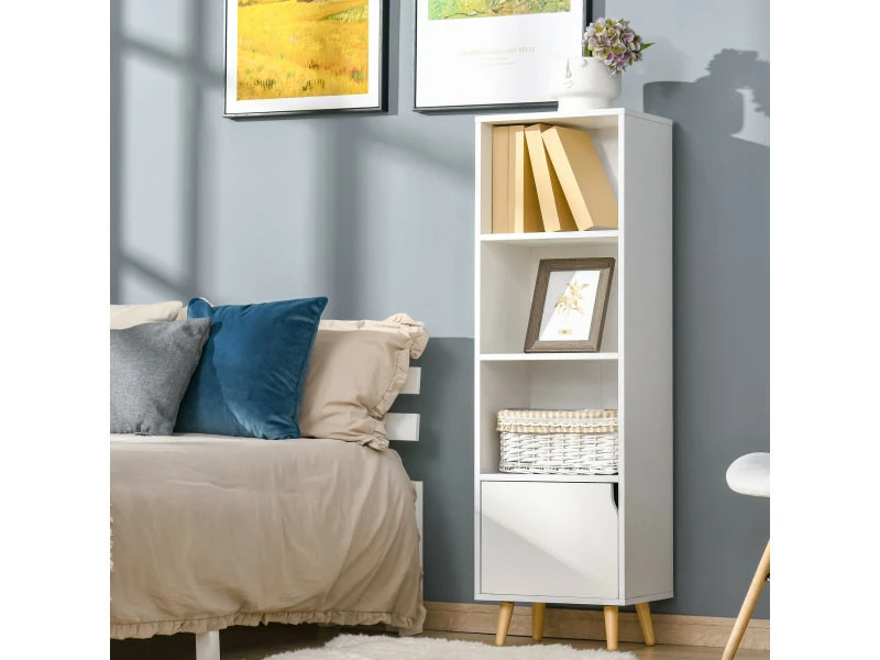 Ce superbe meuble de rangement colonne style scandinave apportera une ambiance cosy nordique très chaleureuse à l’espace intérieur de votre choix : salon, chambre, bureau, etc… Offrant un grand espace de rangement divisé en 3 niches et placard une porte, vous pourrez y ranger vos livres, CD, Blu-ray, décorations, etc…