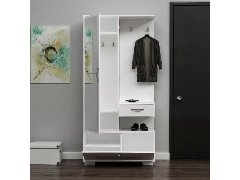 Cette armoire de vestibule moderne et fonctionnelle est la solution idéale pour ranger les vêtements et divers objets. Grâce à son design, il est idéal pour la zone de séjour. Facile à nettoyer et à assembler, kit de montage inclus. Couleur: Blanc | Dimensions: 90x35x184 cm | Matériel: Panneau d’aggloméré mélaminé | Poids du produit: 65,5 kg | Poids pris en charge: 30 Kg | Poids de l’imballage: 66,9 Kg | Nombres de boîtes: 3 | Dimensions de boîtes: W152xD50xH8 cm – W187xD40xH5 cm – W98xD40xH14,8 cm.