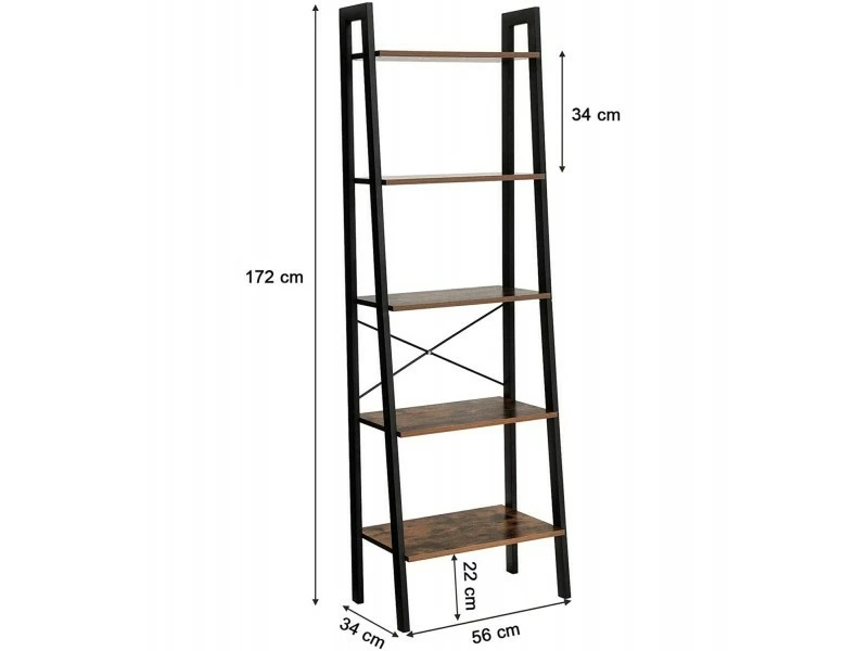 L’étagère comporte 5 tablettes pratiques en panneau de particules. La stabilité du meuble est assurée par sa construction métallique. L’étagère peut être fixée au mur. Ce meuble s’intègre parfaitement dans un salon, une chambre, un couloir ou un bureau. La distance entre les tablettes est de 34 cm. La charge maximale par tablette est de 5 kg, POINTS FORTS: Style rustique, 5x tablette, Finition : tablettes en coloris marron rustique, cadre en coloris noir, Construction stable, Design fonctionnel, CARACTÉRISTIQUES TECHNIQUES: Profondeur 34 cm, Largeur 56 cm, Hauteur 172 cm, Matériau : panneau de particules, métal, À monter soi-même, Photos des articles les plus fidèles possible, mais restant non contractuelles, les nuances de couleur et le rendu des matières présentés à l’écran pouvant être différents de la réalité