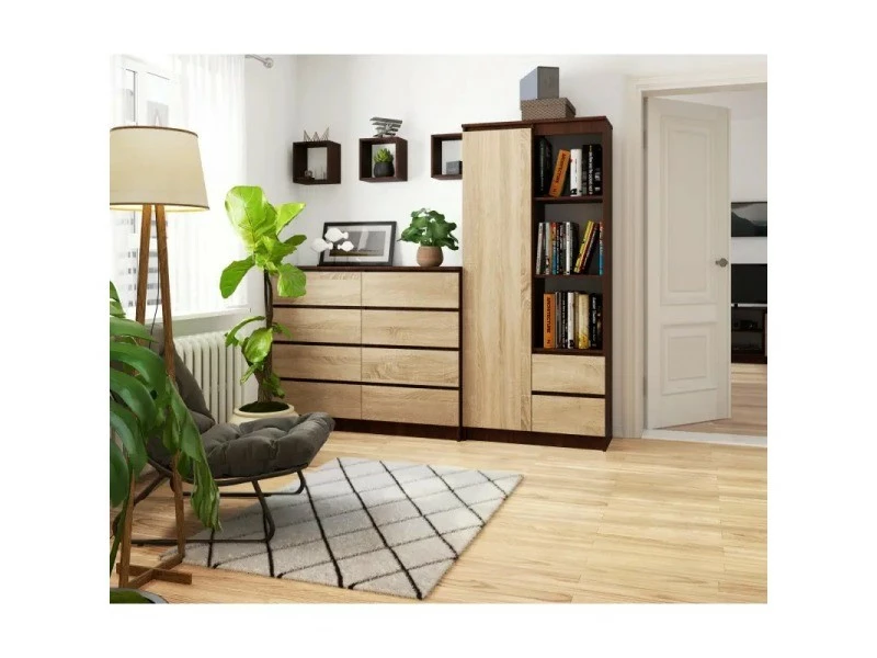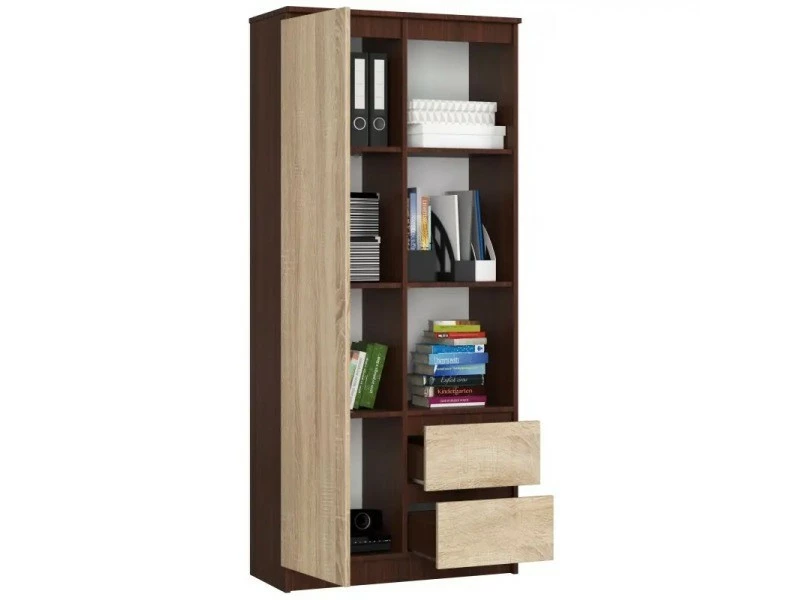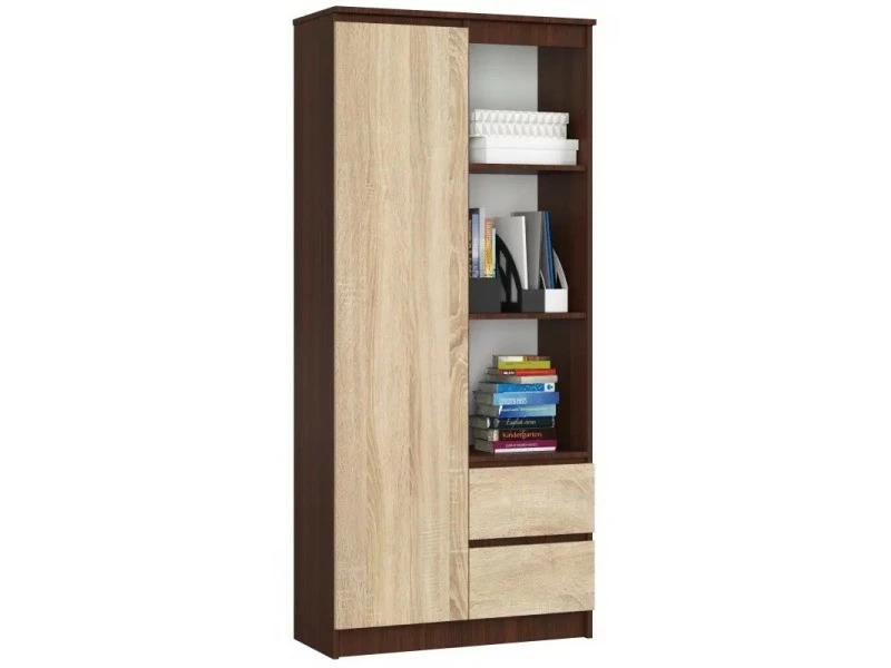 Ce meuble trouvera sa place dans toutes les pièces d’habitation, ainsi que dans les intérieurs de bureaux où il pourra facilement accueillir tous les livres, classeurs et documents. Cette bibliothèque belle et pratique est facile à nettoyer et sa surface est très résistante aux rayures. Le produit présenté comprend à la fois des étagères et des tiroirs qui seront parfaits pour les petits objets. Le corps du meuble est de couleur wengé, tandis que les façades des tiroirs sont de couleur sonoma. POINTS FORTS: Style moderne, 1 porte, 2 tiroirs, 6 tablettes, Design fonctionnel, Faces sans poignée, Résistance élevée aux rayures, CARACTÉRISTIQUES TECHNIQUES: Hauteur : 180 cm, Largeur : 80 cm, Profondeur : 35 cm, Matériau : panneau laminé, À monter soi-même, Photos des articles le plus fidèle possible, mais restant non contractuelles, les nuances de couleur et le rendu des matières présentés à l’écran pouvant être différents de la réalité