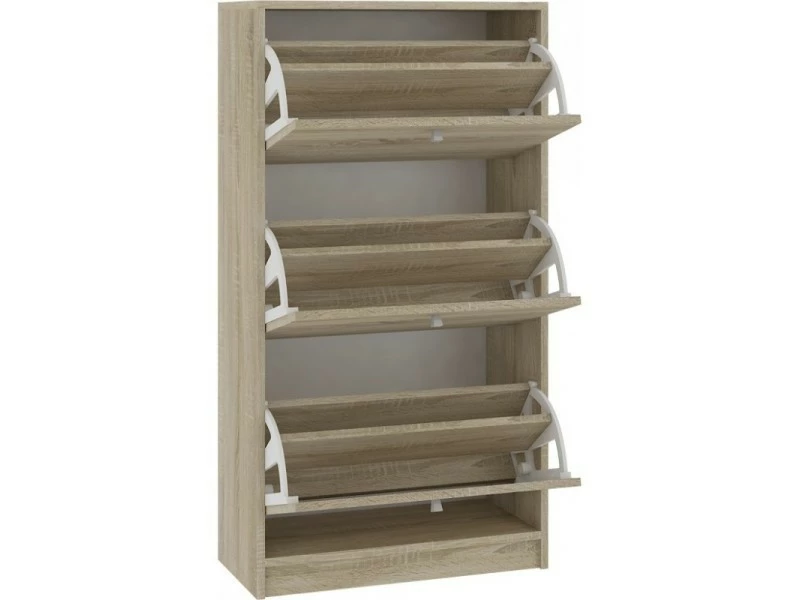 Meuble à chaussures NOKI épuré et élégant, idéal pour chaque entrée. Il est peu encombrant, grâce à ses dimensions compactes et conviendra parfaitement aux petites pièces mais aussi ultra fonctionnel grâce à ses larges compartiments de rangement. Avec sa couleur sobre et design moderne il s’adaptera dans n’importe quel style et décor. Sa structure en panneaux de particules mélaminés se caractérise par une grande durabilité et une finition tendance., POINTS FORTS: 3 portes à rabat, Design moderne et astucieux, Poignées décoratives, Solution parfaite pour l’économie et l’optimisation de l’espace, Robuste, résistant et très stable, CARACTÉRISTIQUES TECHNIQUES: Dimensions: 112.5x60x28.5 cm, Poids: 29 kg, Structure en panneaux bois 16mm, Chants ABS – Résistance aux rayures et à l’abrasion, Meuble à monter soi-même à l’aide de la notice fournie, Photos des articles le plus fidèle possible, mais restant non contractuelles, les nuances de couleur et le rendu des matières présentés à l’écran pouvant être différents de la réalité