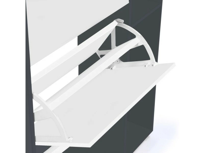 Ouvrez chaque casier à l’aide de la poignée finition argentée. Le mécanisme type menu déroulant vous permet de choisir rapidement la paire qu’il vous faut. Chaque espace de rangement possède une planche modulable séparant les deux rangées de paires de chaussures.