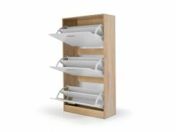 Gagnez du temps et optimisez l’espace dans votre maison avec notre meuble à chaussures imitation hêtre et ses 3 portes blanches.