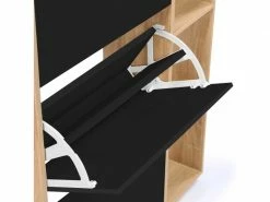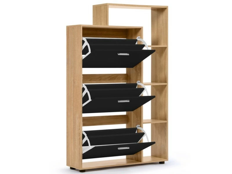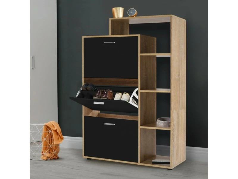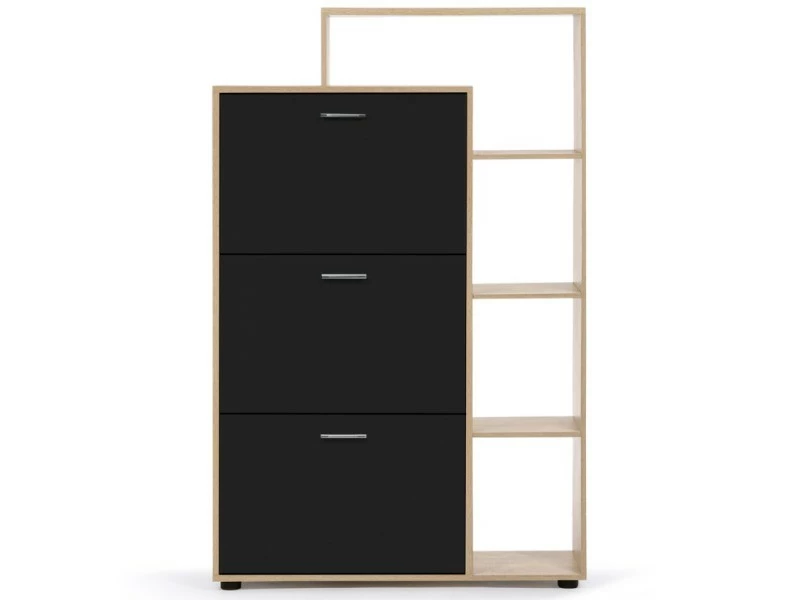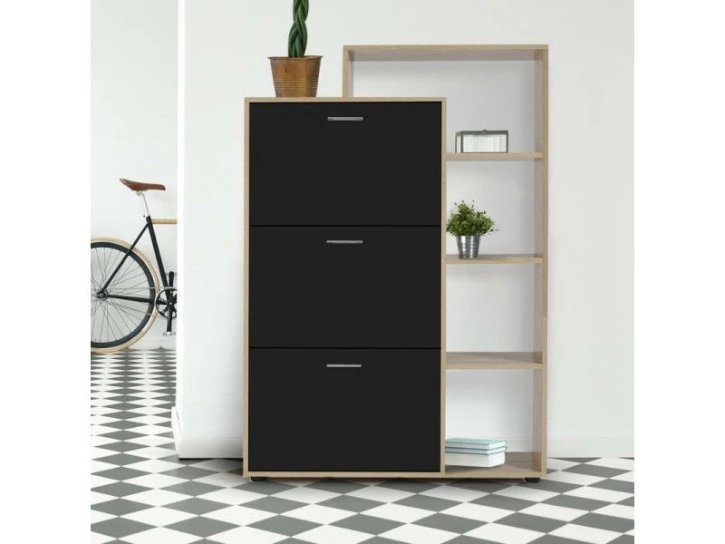 Descriptif du meuble à chaussures imitation hêtre 3 portes noires avec étagère