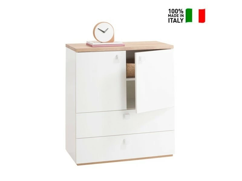 La commode Ottavia est le choix parfait si vous souhaitez donner de l’ordre et rendre la zone de couchage plus élégante. Entièrement réalisée avec des matériaux de qualité 100% Made in Italy dans un style moderne, la commode Ottavia s’intègre parfaitement à tout type de chambre grâce à ses couleurs douces et naturelles de blanc brillant et de bois clair. L’espace de rangement vous permet de ranger des vêtements tels que des pulls, des chemises, des sous-vêtements ou du linge de lit dans les deux grands tiroirs coulissants à la base et dans les deux compartiments supérieurs confortables. Grâce à son design épuré, compact et polyvalent, la commode Ottavia trouve facilement sa place dans les plus petites pièces comme dans les autres pièces de la maison : elle peut être utilisée par exemple dans le salon comme placard pour ranger la vaisselle ou vaisselle, sur le mur de la maison. » entrée comme vide poche pour les accessoires du quotidien, comme meuble bas au bureau pour ranger documents et dossiers, dans la chambre des enfants pour ranger matériel scolaire ou jouets, sans oublier que le support agréable la surface vous permet d’afficher des décorations, de placer des lampes, des ornements, des vases avec des fleurs, des cosmétiques, des bijoux et tout autre élément dispersé dans la maison. ProduceShop sélectionne uniquement les meilleurs produits pour chaque catégorie en fonction de caractéristiques qualitatives et esthétiques dans le but de ne distribuer sur le marché que des articles qui satisfont pleinement les besoins de ses clients. Caractéristiques techniques : Dimensions : 90 x 45 x 100 cm (largeur, profondeur, hauteur) Produit et design de qualité 100% Made in Italy Poids : 54,5 kg Construction solide et robuste Bois provenant de forêts gérées de manière correcte et responsable (certification FSC) Compartiment avec ouverture à charnière et étagère de séparation interne 2 tiroirs coulissants avec guides métalliques à billes étanches Surface lisse avec poignées blanches partiellement transparentes Design moderne qui peut être combiné avec tout type d’intérieur Mobilier polyvalent, décoratif et fonctionnel pour de multiples environnements Idéal pour la chambre, le salon, le hall et d’autres espaces Haute sécurité et stabilité grâce à une fabrication de haute qualité Rapport poids/résistance parfait Surface facile d’entretien Couleur : bois et façades blanc laqué brillant