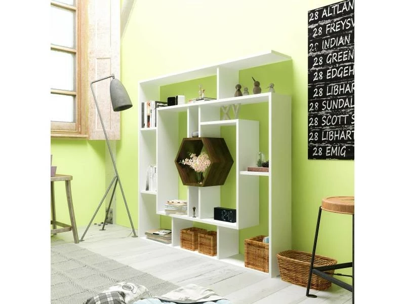Un regard suffit pour savoir que cette bibliothèque Magistralis au design moderne et atypique, en bois mélaminé, sera la pièce maîtresse d une décoration chic et intemporelle. Si elle semble imposante, elle offre un encombrement limité pour un espace de rangement généreux. L apport décoratif réside essentiellement dans cette niche polygonale en contraste avec le reste de la pièce.