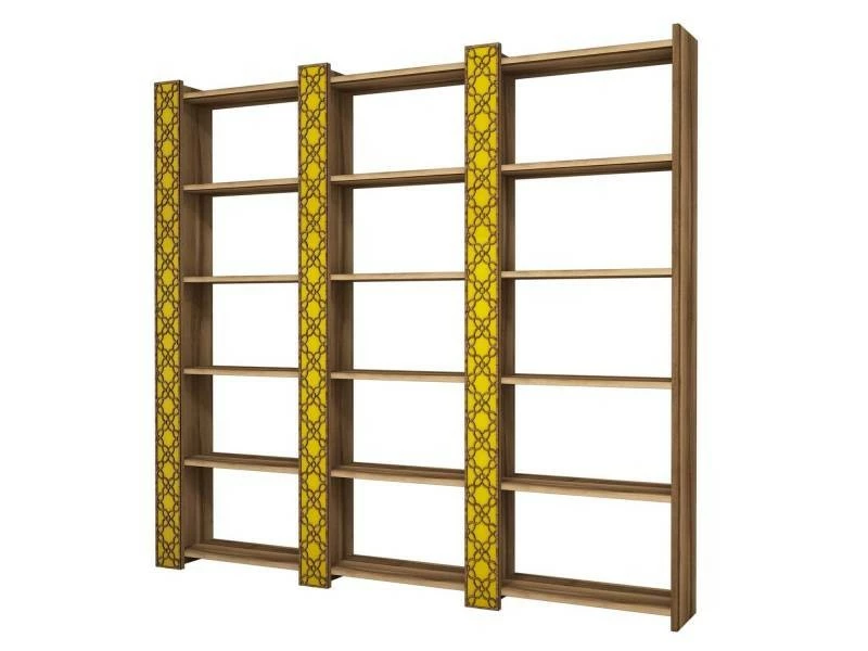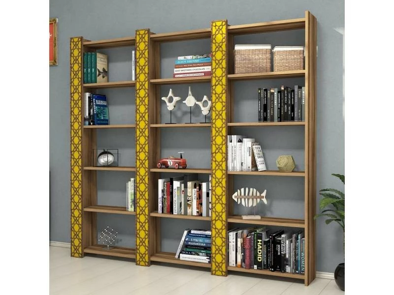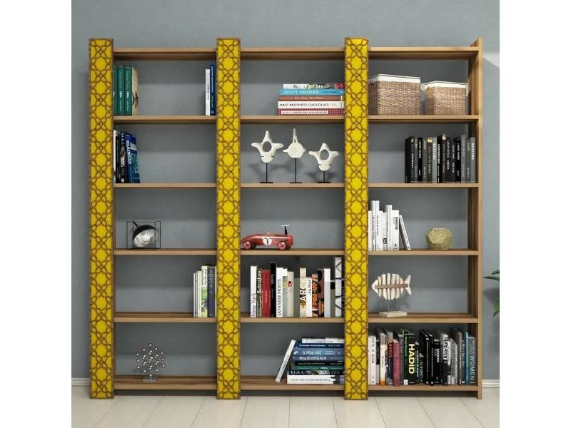 Sculpturale, l’étagère bibliothèque Oppidanus 3 rangées H170 cm Mélaminé et Plastique Noyer et Jaune ne passe pas inaperçu avec ses pans ornementés et coloré en façade. Elle saura mettre en valeur vos trésors : livres, collection de disques, bibelots et objets décoratifs en tout genre… En tout, six de tablettes pour un maximum d’espace d’exposition !