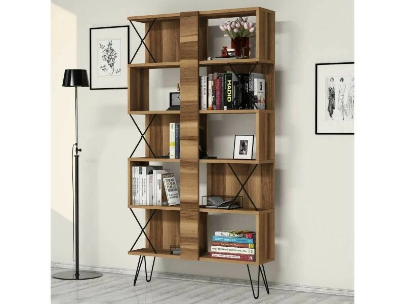 Panachez votre décor minimaliste avec la note bien industrielle de cette étagère bibliothèque Transire H167,5 cm Mélaminé Noyer. De finition unie, elle dépeint un joli spectacle de formes pleines et évidées, mais aussi un contraste ravissant de design massif et filaire, grâce aux pieds épingles et les croisillons de ses niches.