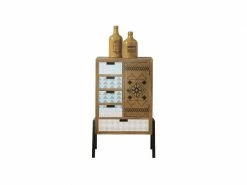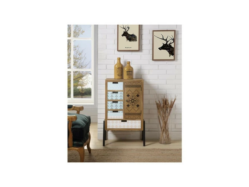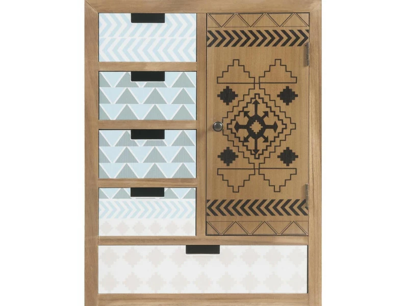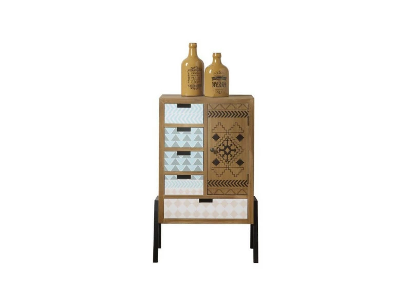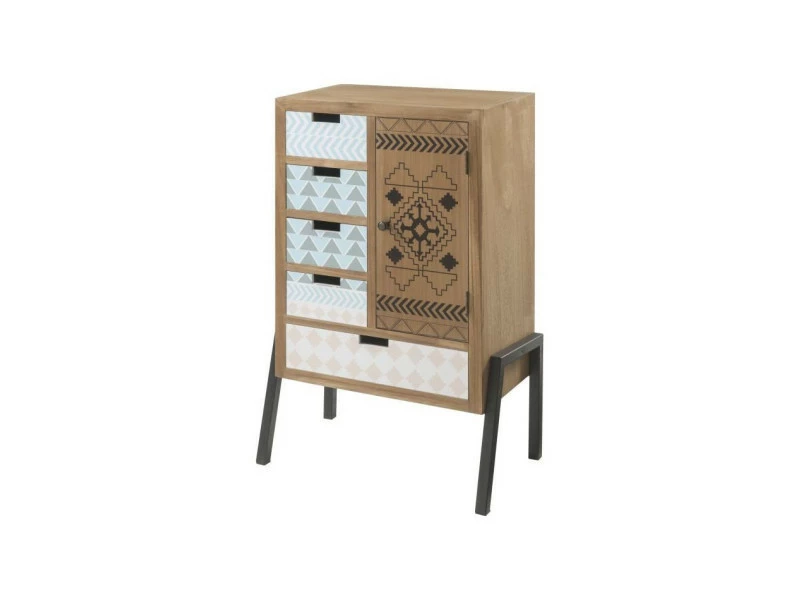 MERIDA Buffet haut en MDF marron – Style et design ethnique – 1 porte et 5 tiroirs motif Ă©quateur – Pieds en mĂ©tal noir – Dimensions totales : L 52 x P 30 x H 90 cm.