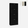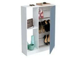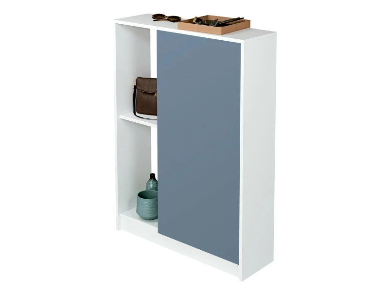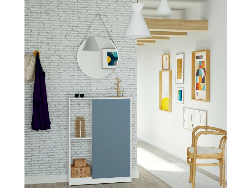 Meuble à chaussures en panneaux de particules et mélamine haute densité coloris blanc brillant/bleu d’une porte et 2 niches, peut ranger environ 6 paires de chaussures. Barre en aluminium. Quincaillerie à fixer au mur inclus. Produit de fabrication Espagnol certifié PEFC. Livré en kit. Dimensions : Hauteur 110 x Longueur 80 x Profondeur 25 cm Dimensions intérieures : hauteur 48,5 x Longueur 29 x profondeur 22,5 cm Matière : panneaux de particules et mélamine haute densité Coloris : Blanc brillant / bleu Poids : 22.5 kg