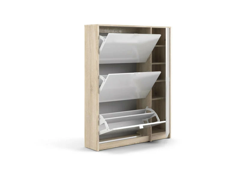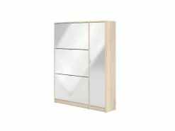 Meuble à chaussures à quatre ouvertures et double profondeur, entièrement de couleur chêne. Étagère à chaussures pratique pour un rangement ordonné des chaussures. Ce meuble entièrement construit en stratifié a des lignes simples et discrètes. Grâce à ce particulier, il est en effet possible de le placer dans n’importe quelle pièce de la maison, de l’entrée au placard ou dans le couloir ou sur le balcon. Dimensions en cm : 98 x 123 x 24